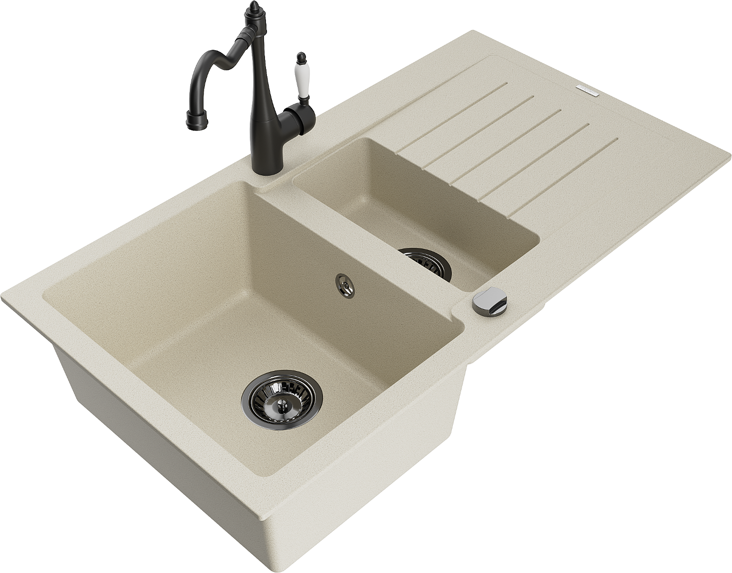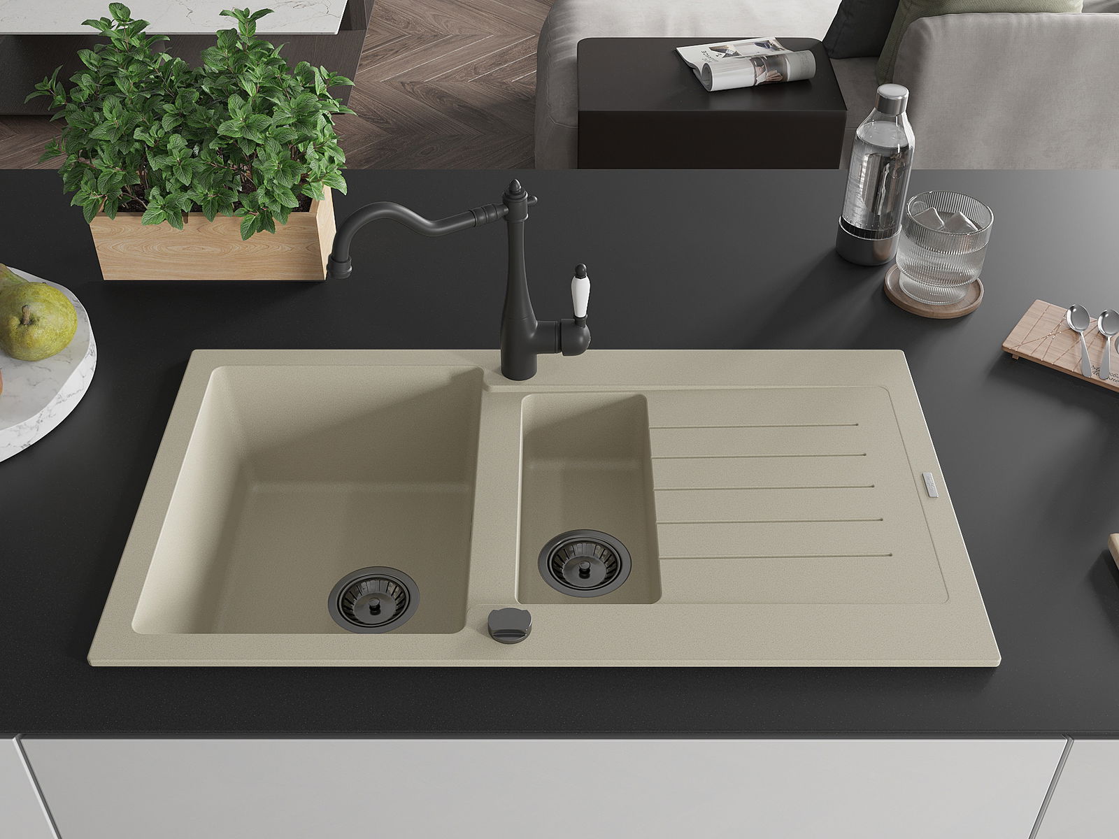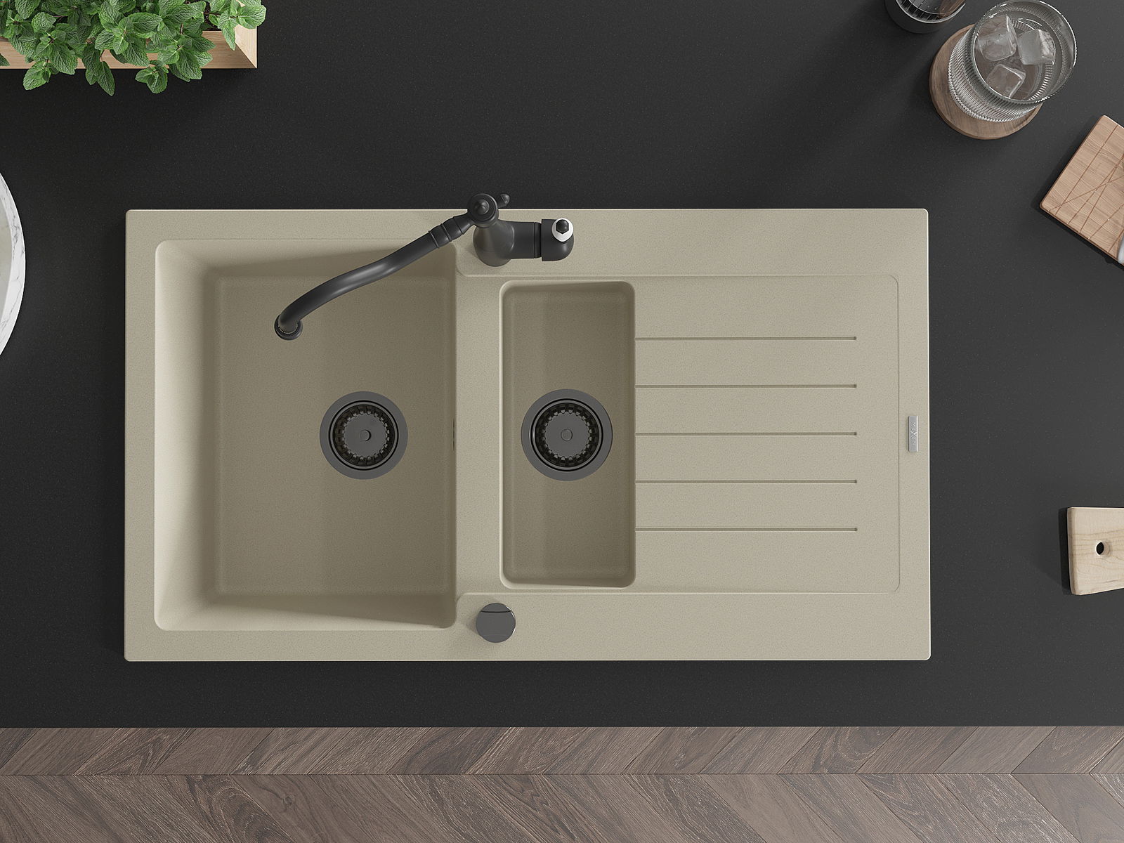 Mexen Matias zlewozmywak granitowy 1,5-komorowy z ociekaczem i baterią kuchenną Carla, beżowy - 6502-69-670700-70