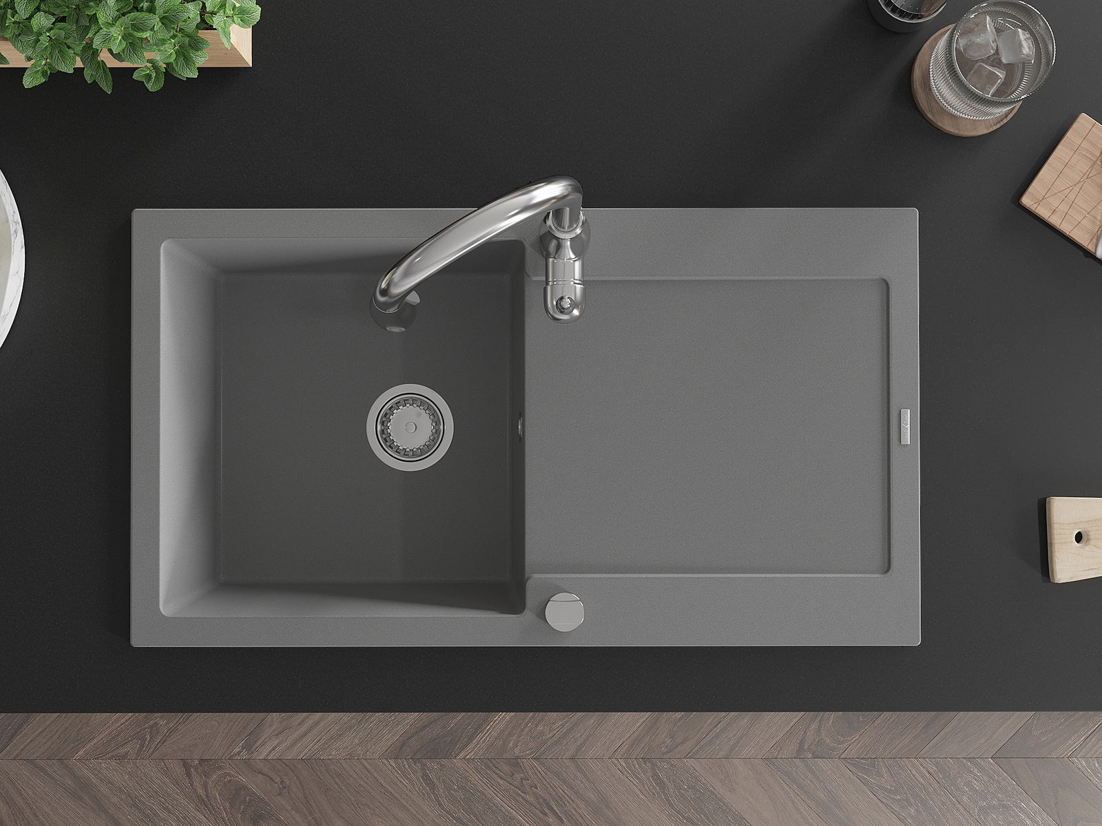 Mexen Leo zlewozmywak granitowy 1-komorowy z ociekaczem i baterią kuchenną Savita, szary - 6501-71-672601-00