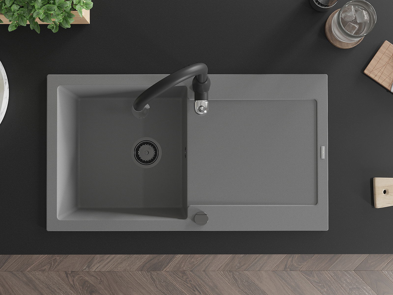 Mexen Leo zlewozmywak granitowy 1-komorowy z ociekaczem i baterią kuchenną Savita, szary - 6501-71-672601-70-B