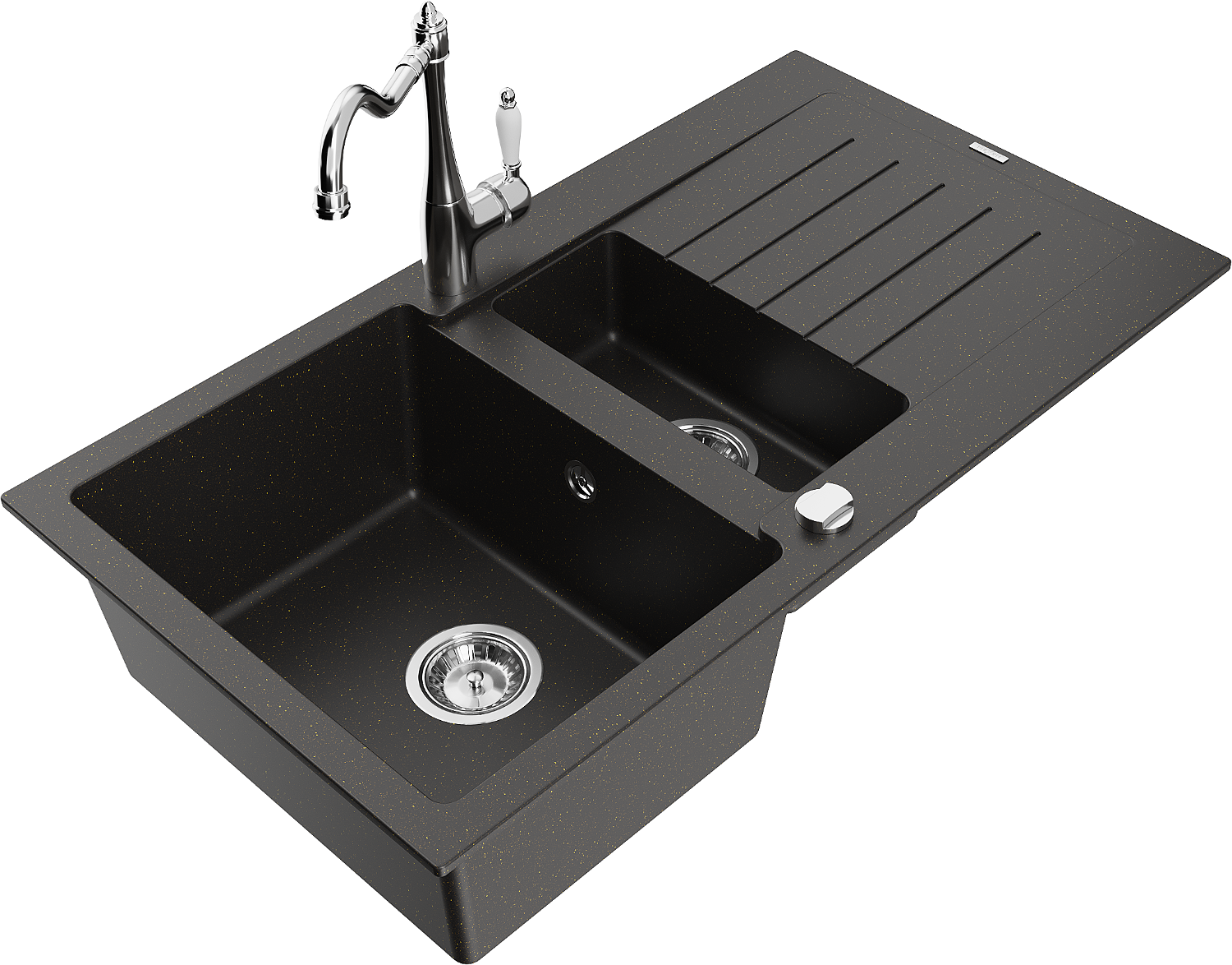 Mexen Matias zlewozmywak granitowy 1,5-komorowy z ociekaczem i baterią kuchenną Carla, czarny/złoty metalik - 6502-75-670700-00