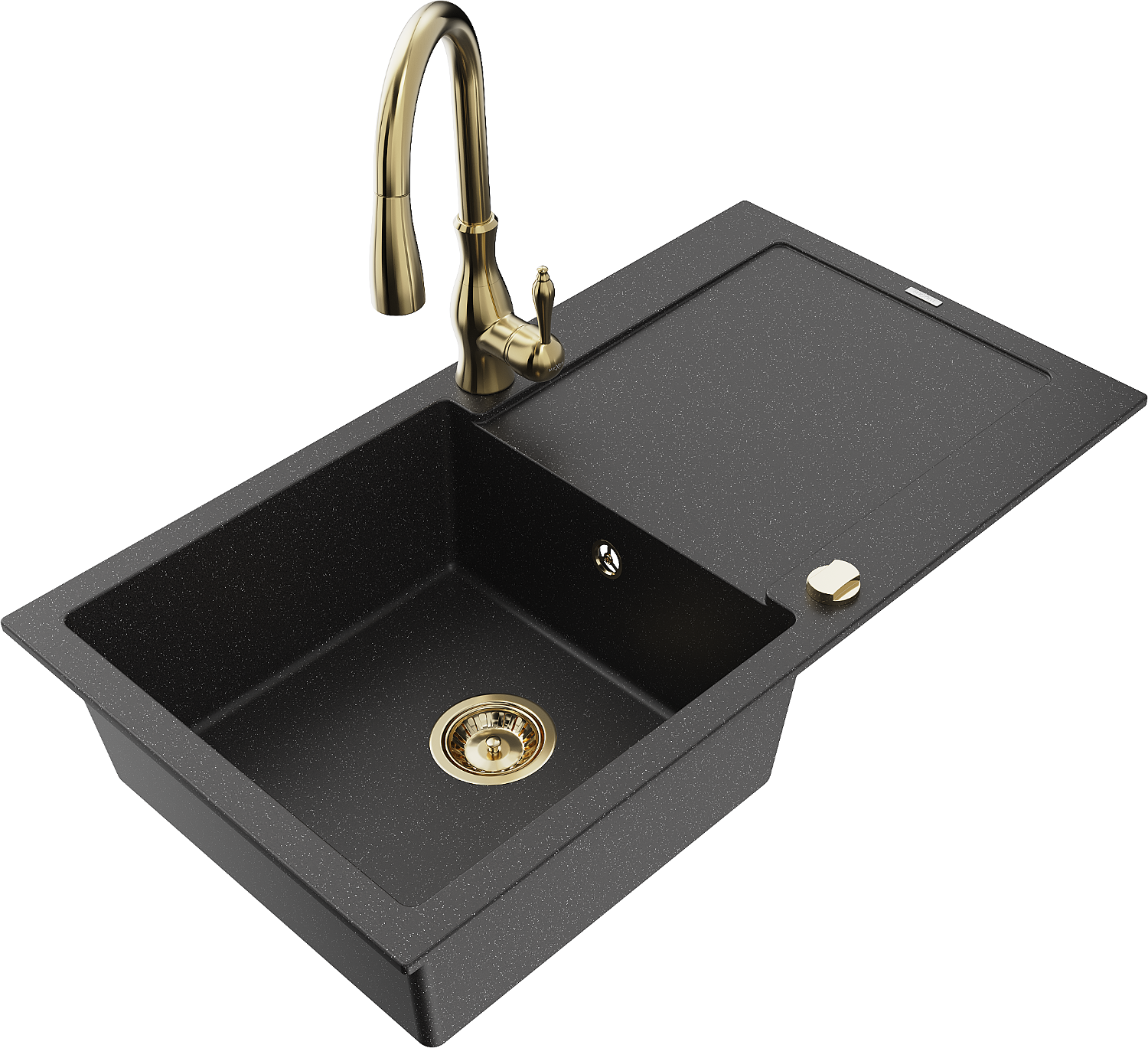 Mexen Leo zlewozmywak granitowy 1-komorowy z ociekaczem i baterią kuchenną Savita, czarny/srebrny metalik - 6501-73-672601-50