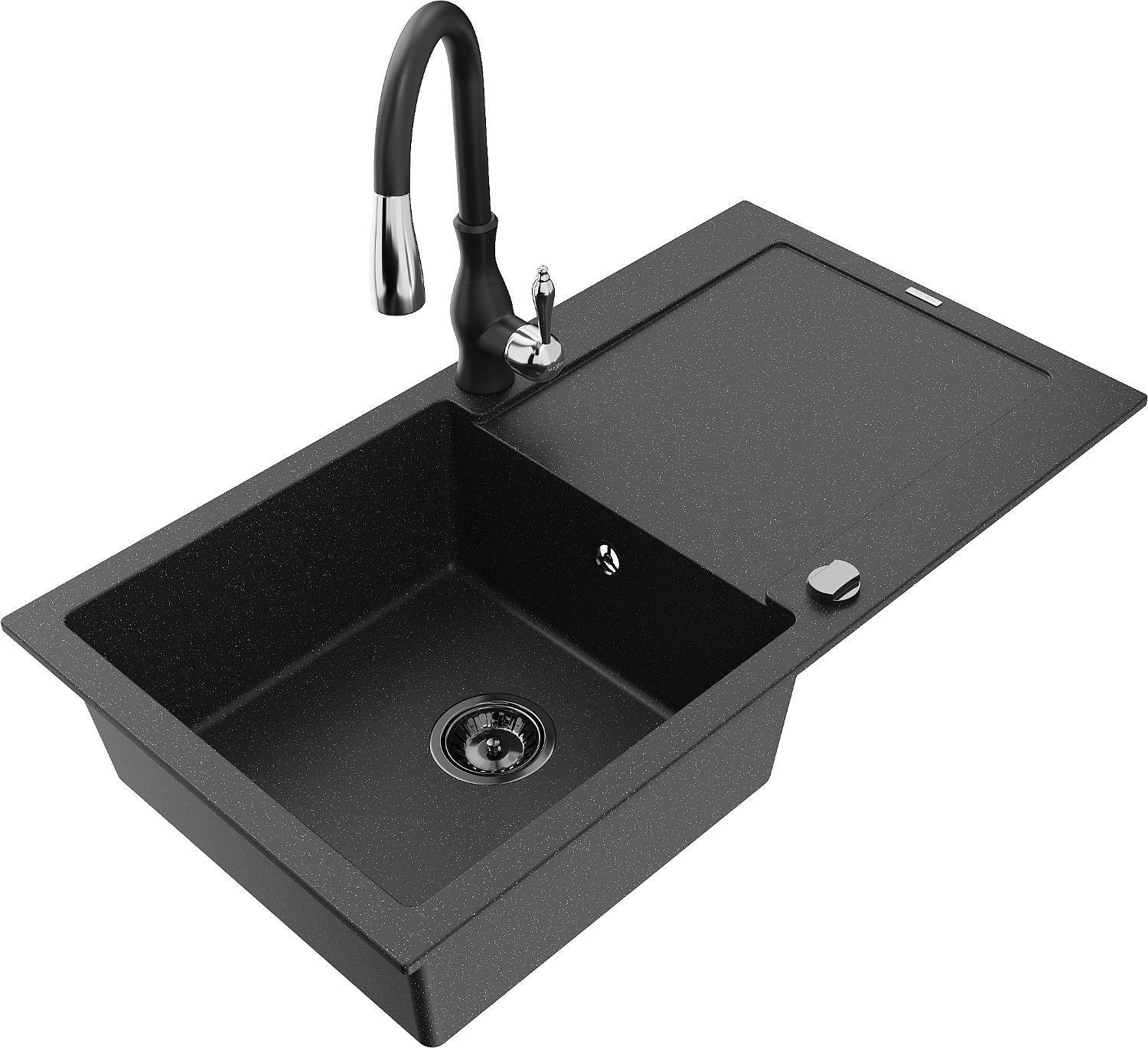Mexen Leo zlewozmywak granitowy 1-komorowy z ociekaczem i baterią kuchenną Savita, czarny/srebrny metalik - 6501-73-672601-70-B