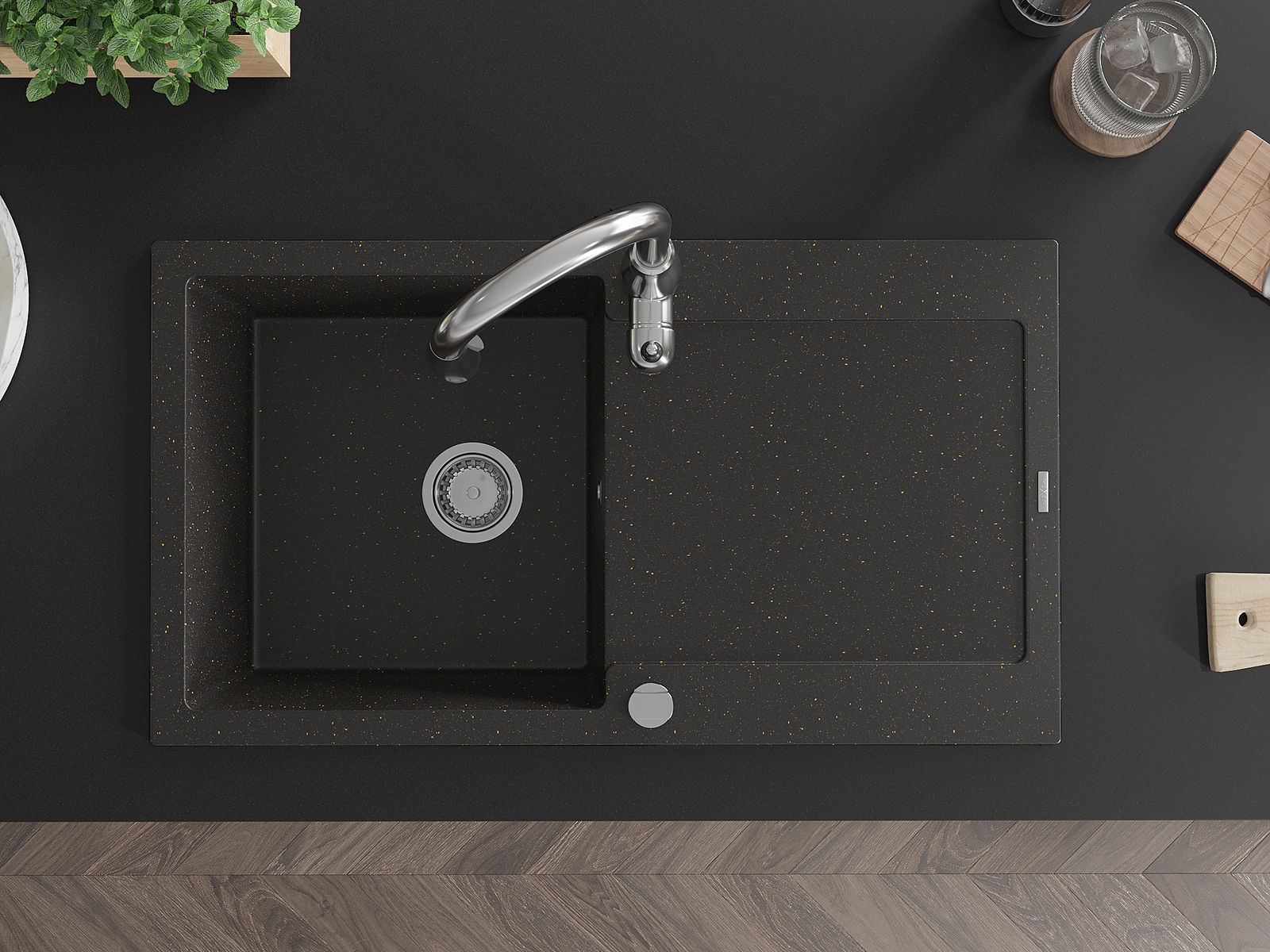Mexen Leo zlewozmywak granitowy 1-komorowy z ociekaczem i baterią kuchenną Savita, czarny/złoty metalik - 6501-75-672601-00