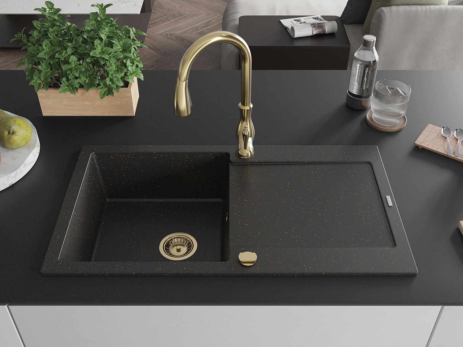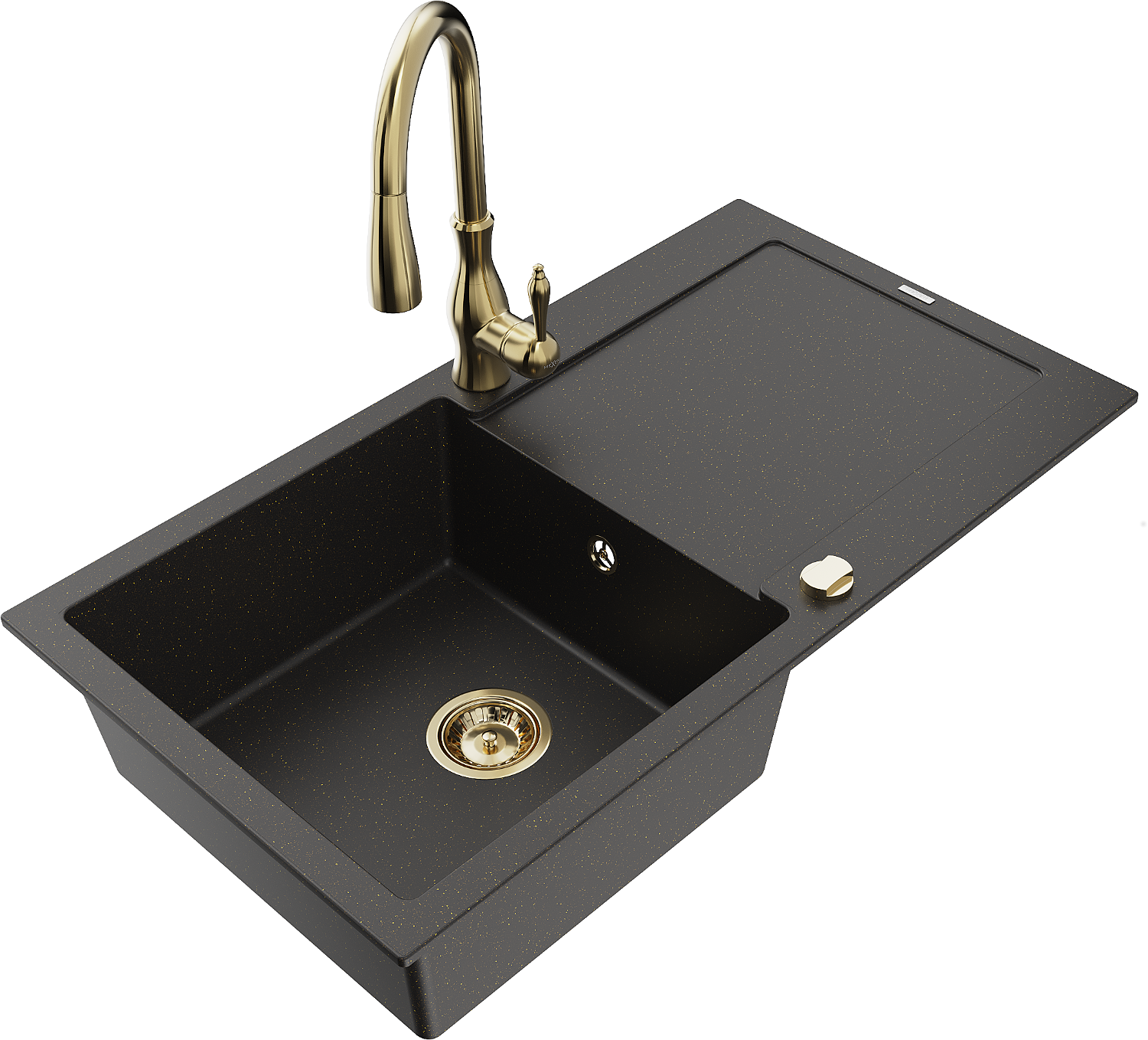 Mexen Leo zlewozmywak granitowy 1-komorowy z ociekaczem i baterią kuchenną Savita, czarny/złoty metalik - 6501-75-672601-50