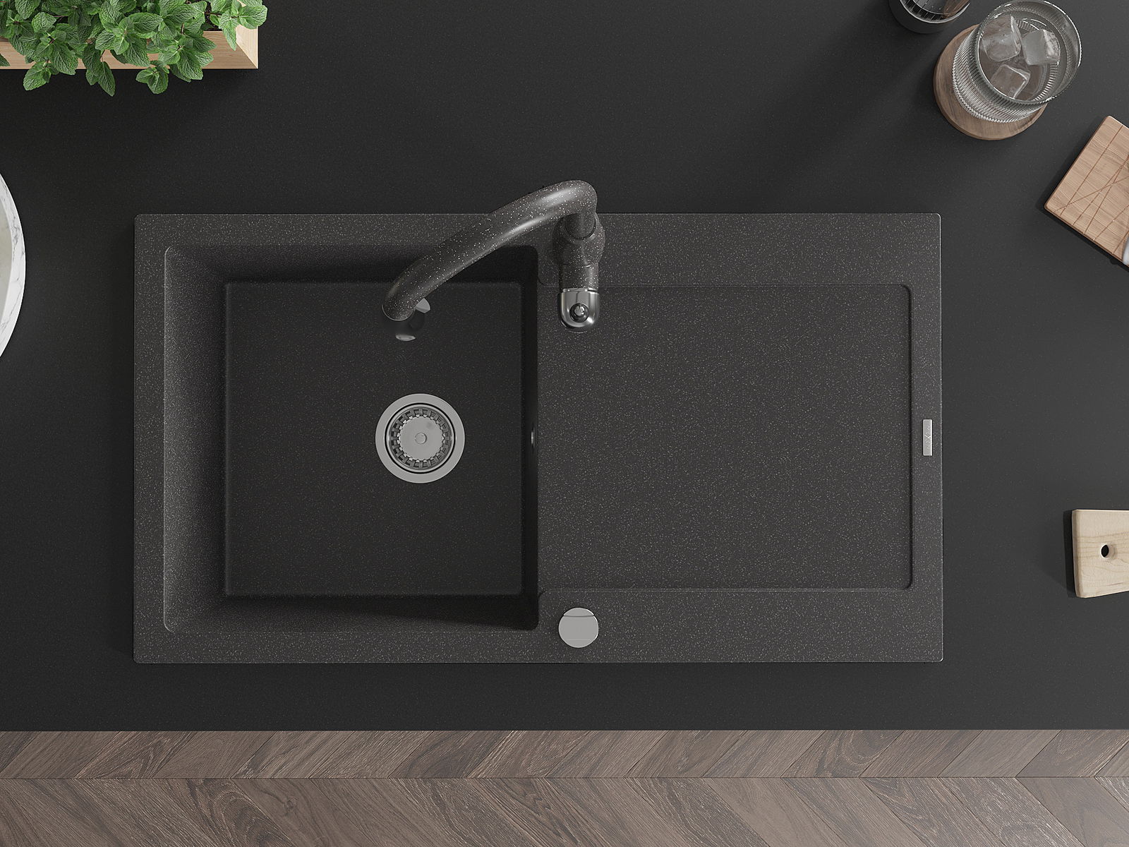 Mexen Leo zlewozmywak granitowy 1-komorowy z ociekaczem i baterią kuchenną Savita, czarny nakrapiany - 6501-76-672601-76