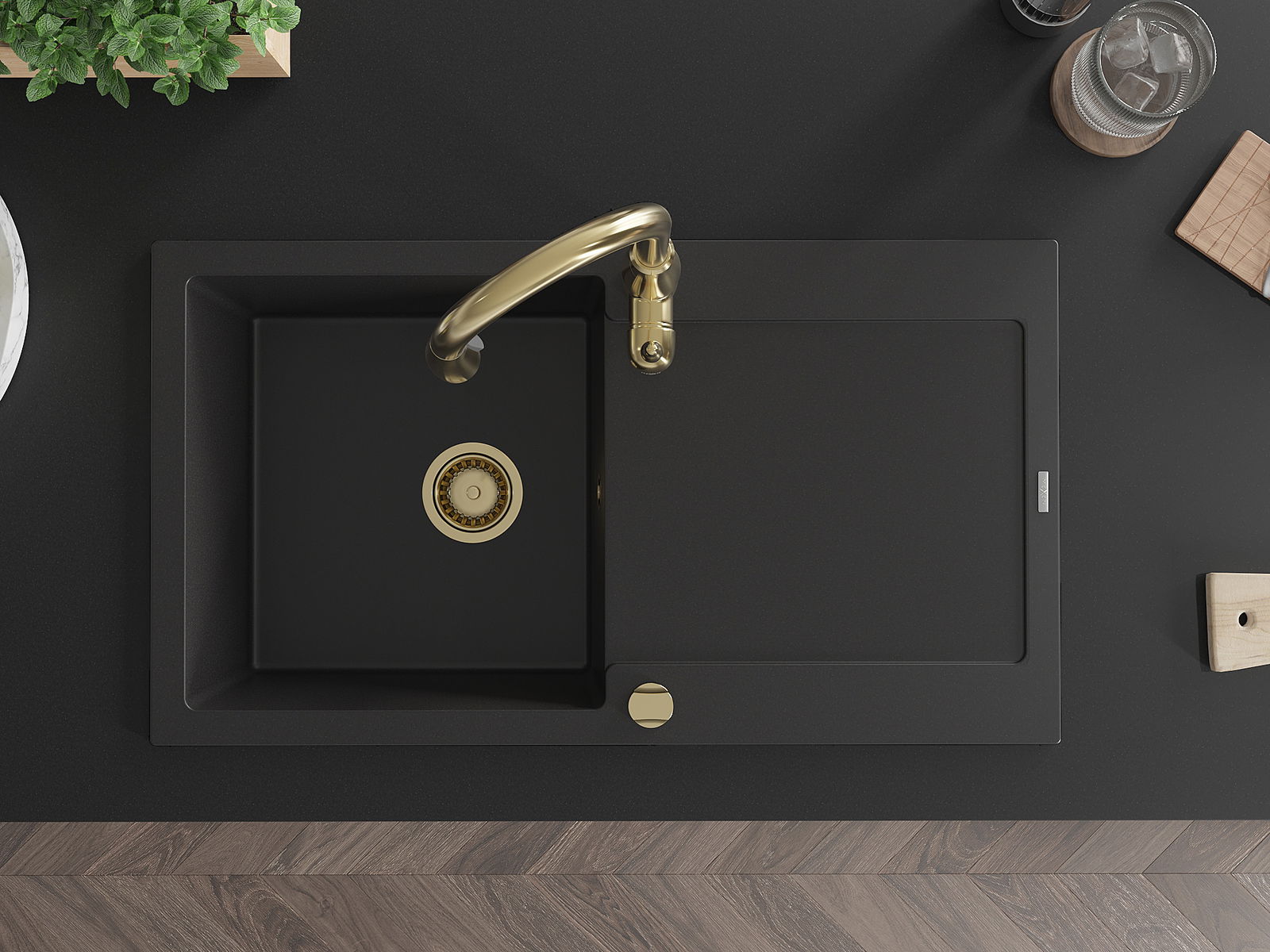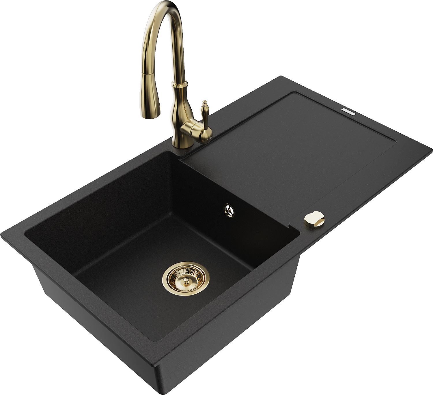 Mexen Leo zlewozmywak granitowy 1-komorowy z ociekaczem i baterią kuchenną Savita, czarny - 6501-77-672601-50