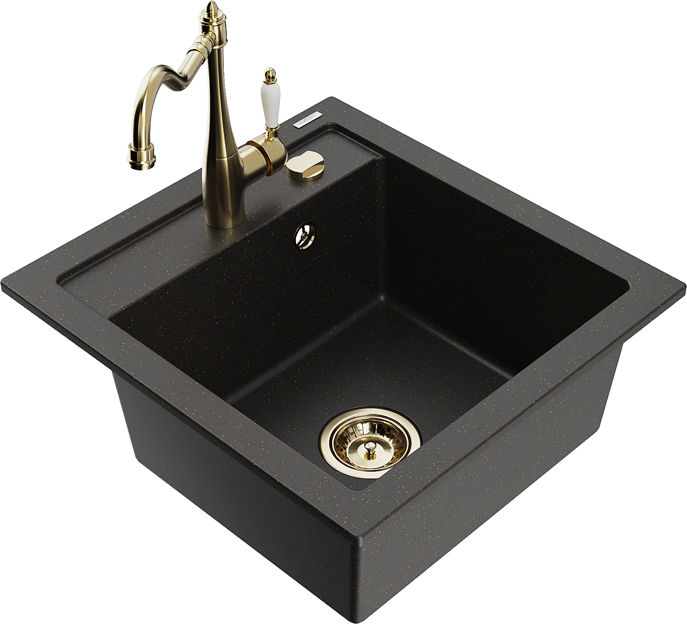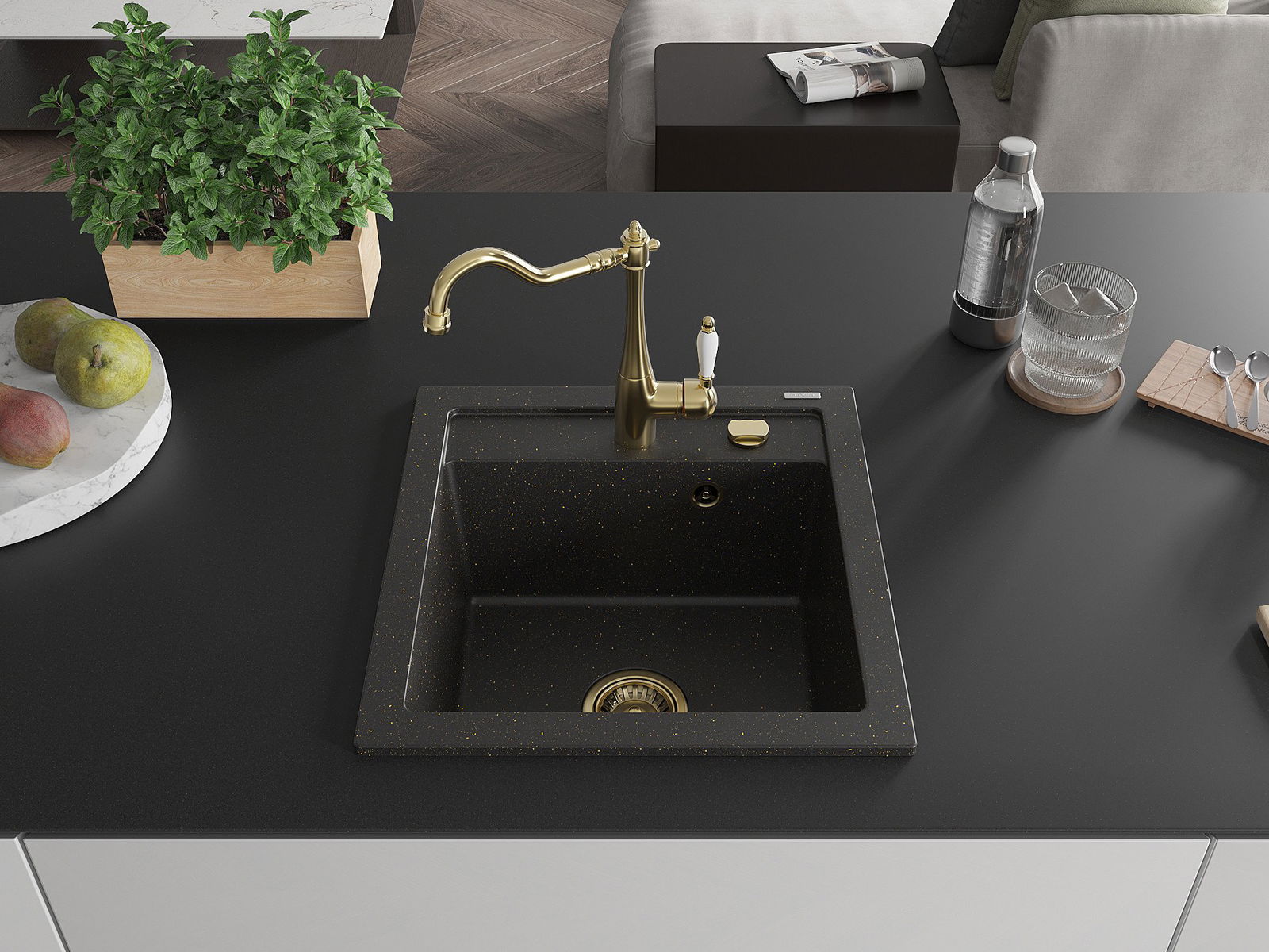 Mexen Vito zlewozmywak granitowy 1-komorowy z baterią kuchenną Carla, czarny/złoty metalik - 6503-75-670700-50