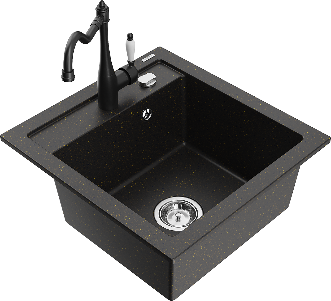 Mexen Vito zlewozmywak granitowy 1-komorowy z baterią kuchenną Carla, czarny/złoty metalik - 6503-75-670700-70
