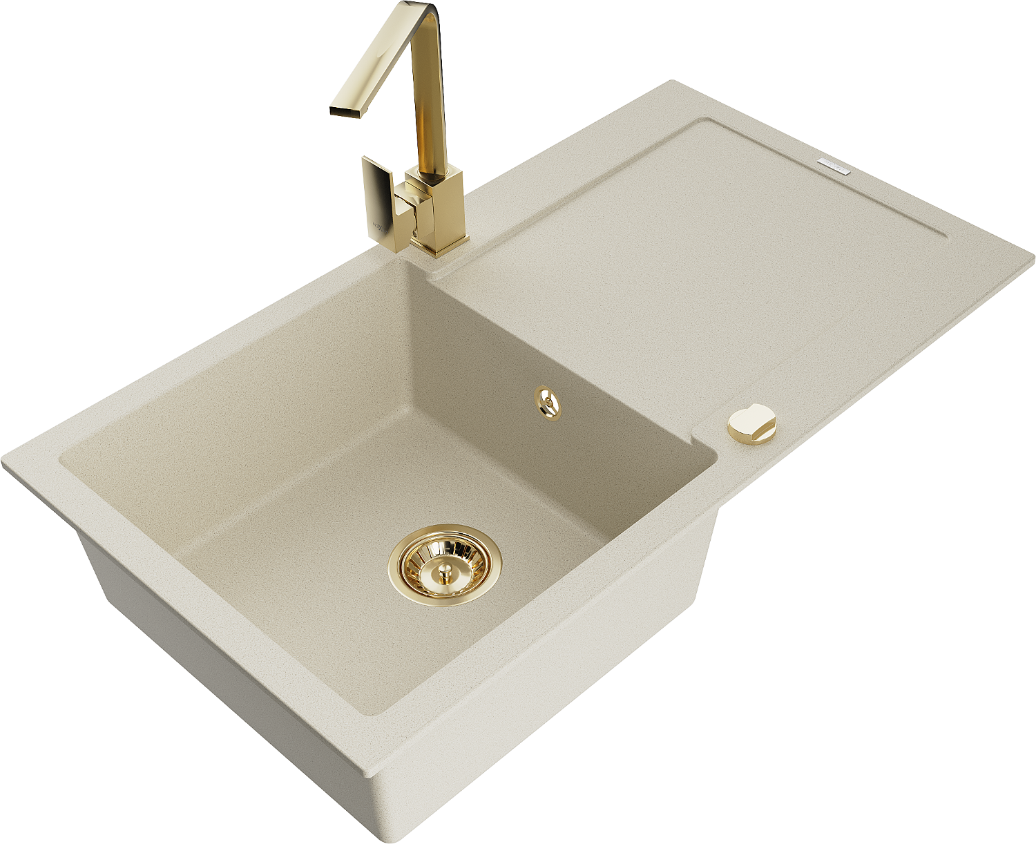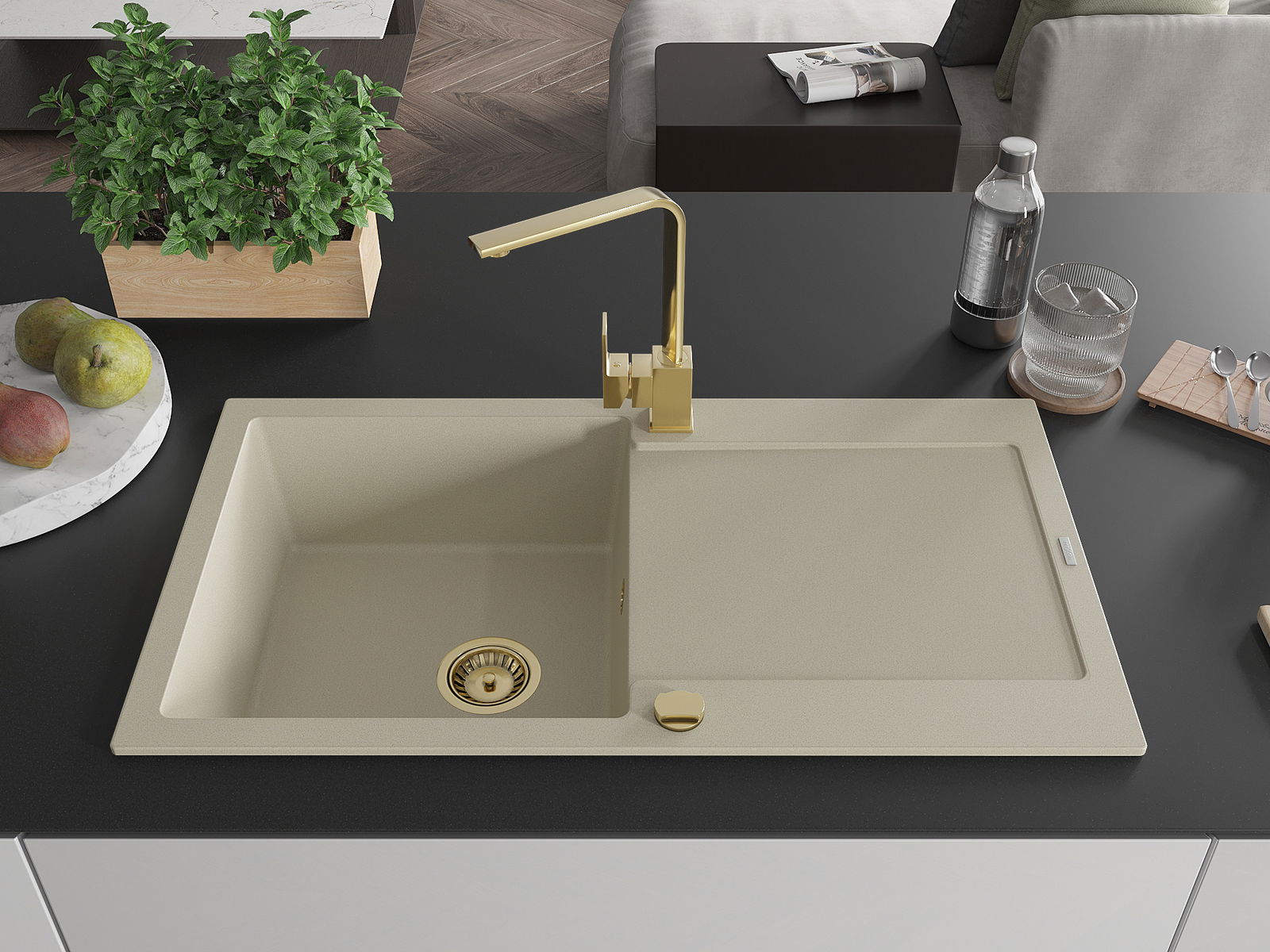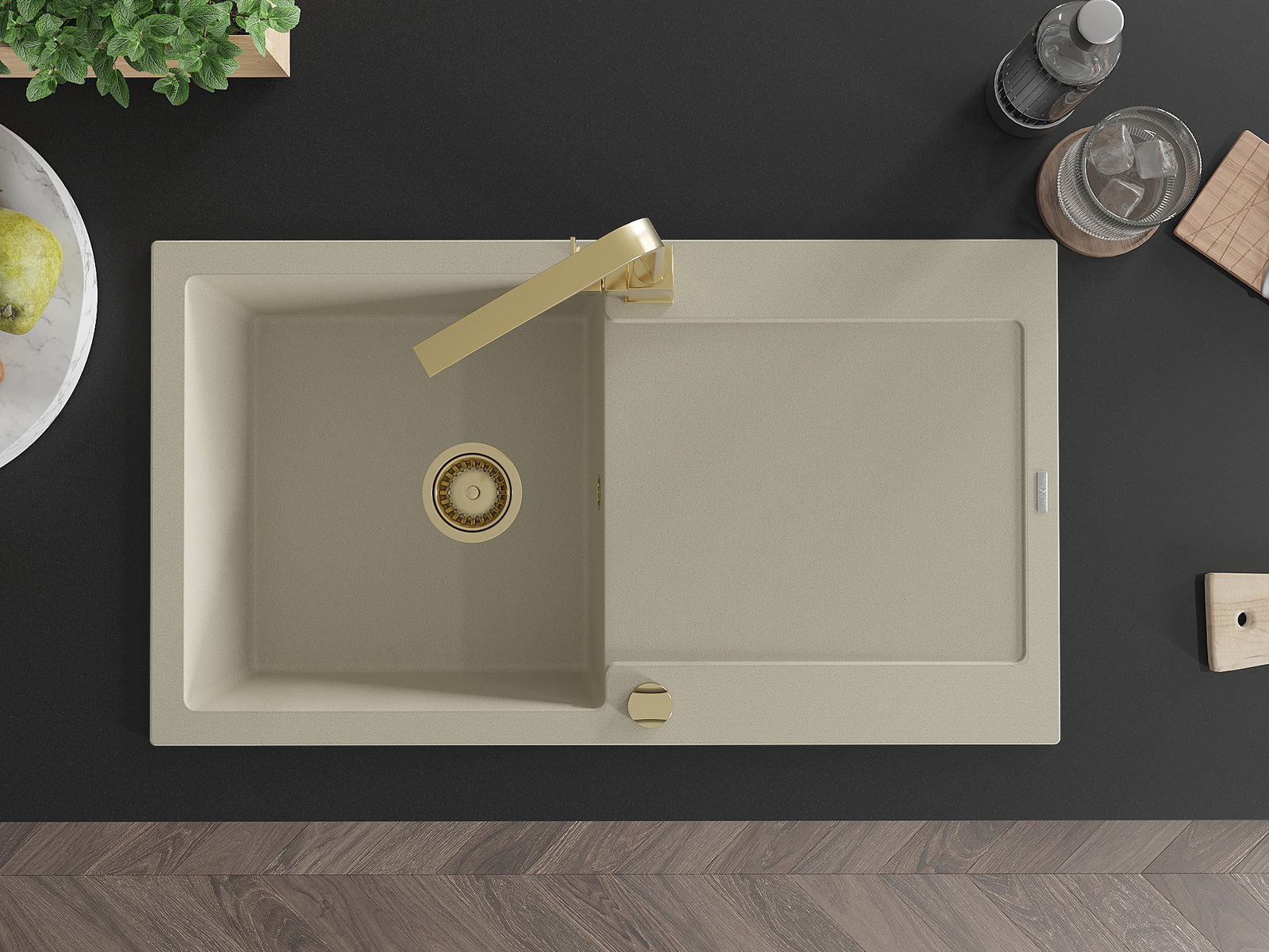Mexen Leo zlewozmywak granitowy 1-komorowy z ociekaczem i baterią kuchenną Rita, beżowy - 6501-69-670300-50