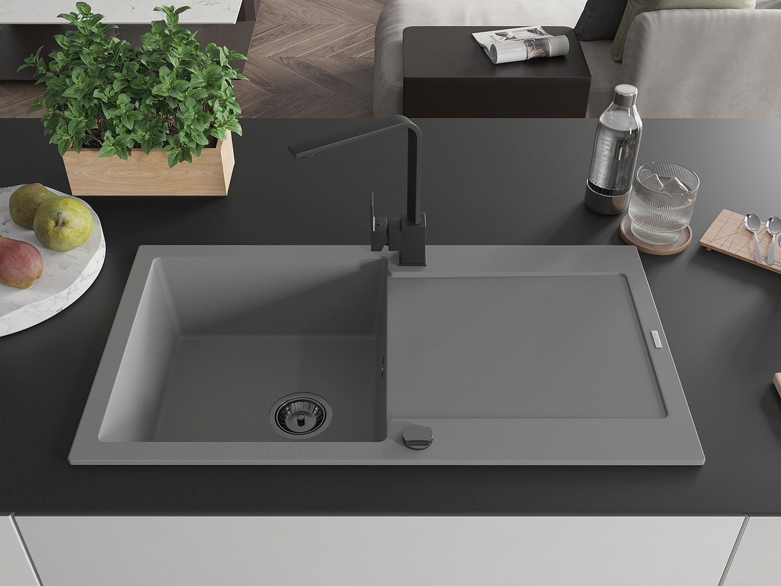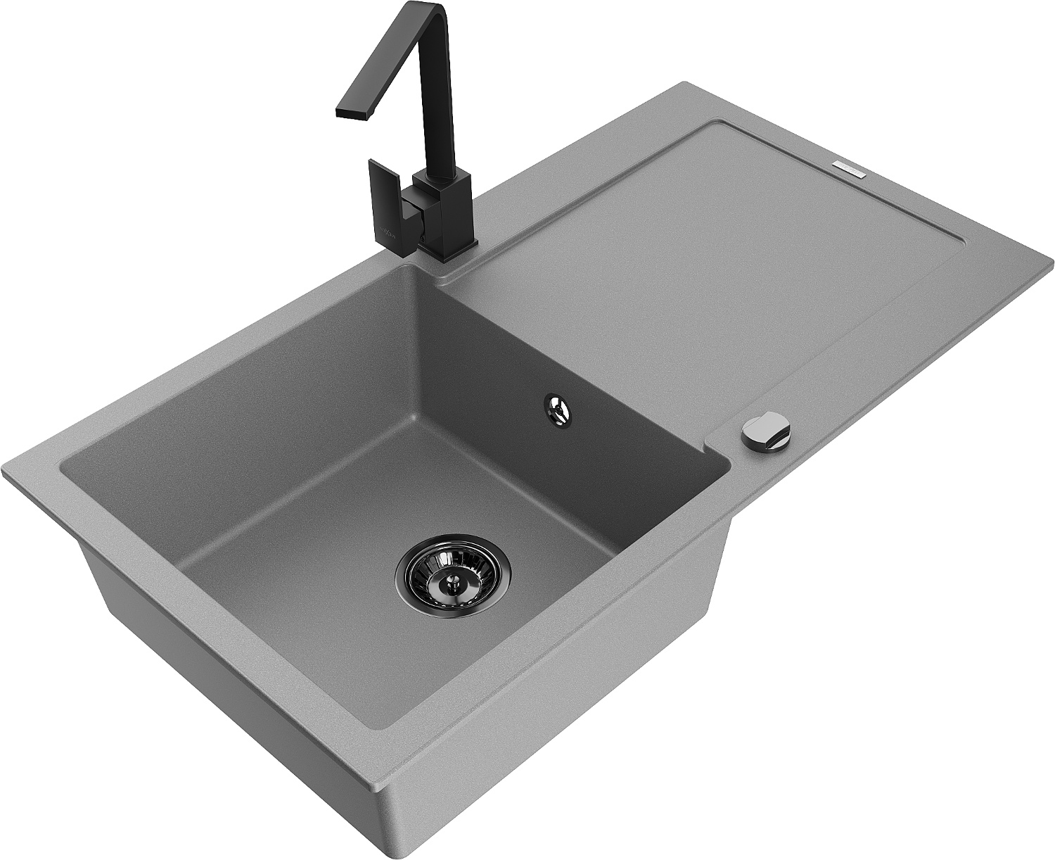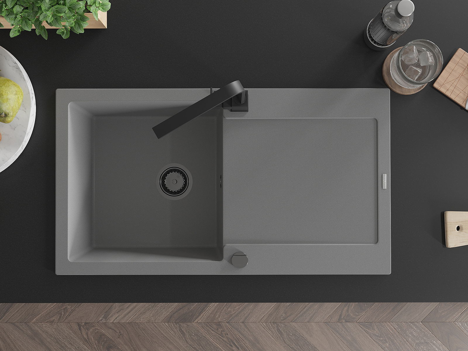 Mexen Leo zlewozmywak granitowy 1-komorowy z ociekaczem i baterią kuchenną Rita, szary - 6501-71-670300-70-B