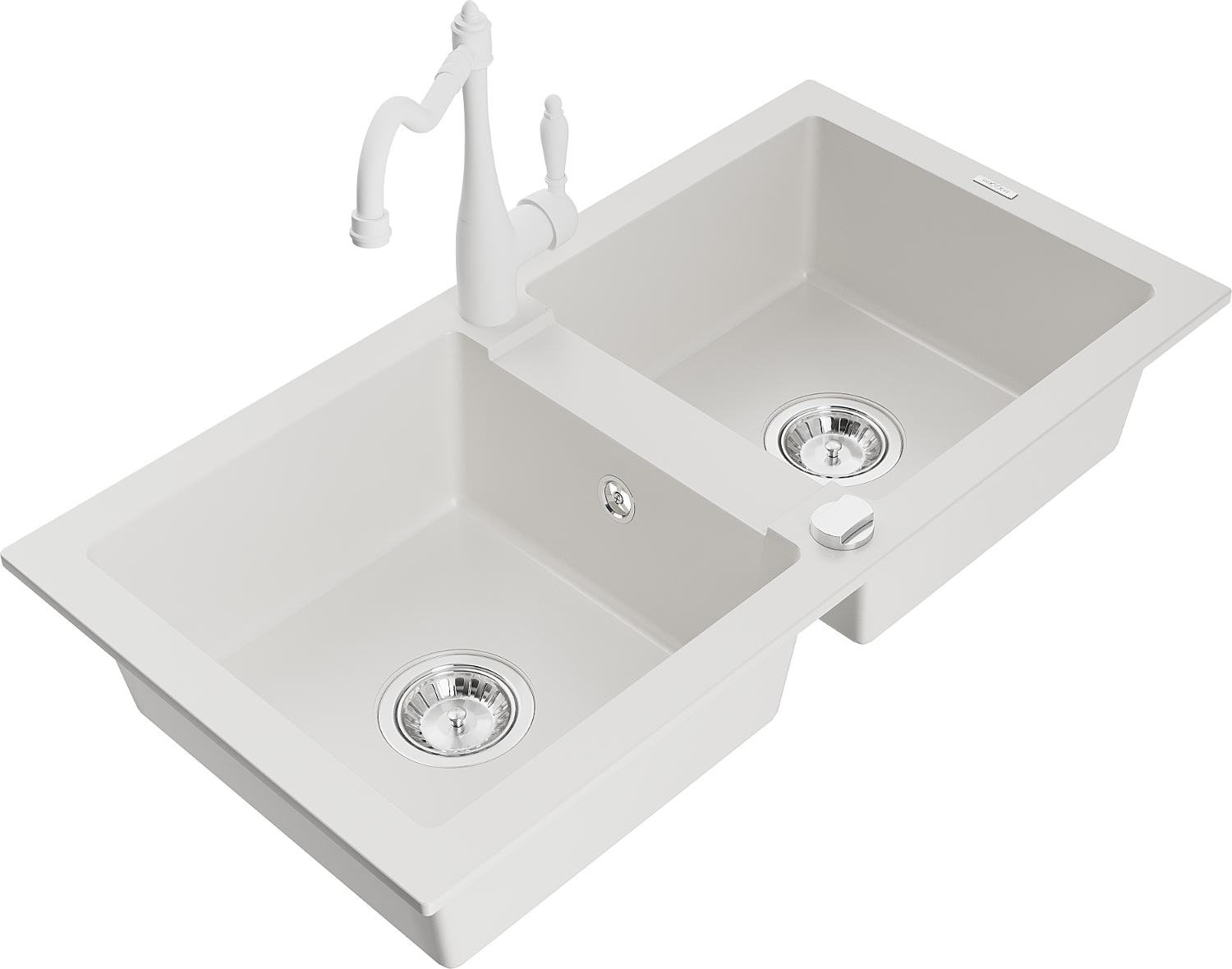 Mexen Mario zlewozmywak granitowy 2-komorowy z baterią kuchenną Carla, biały - 6504-20-670700-20