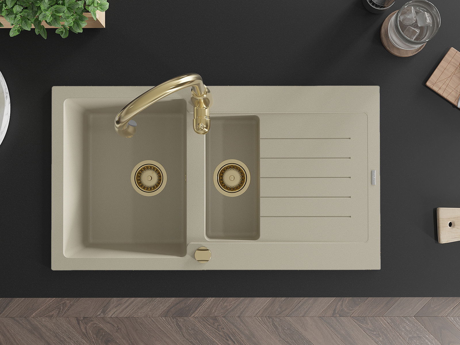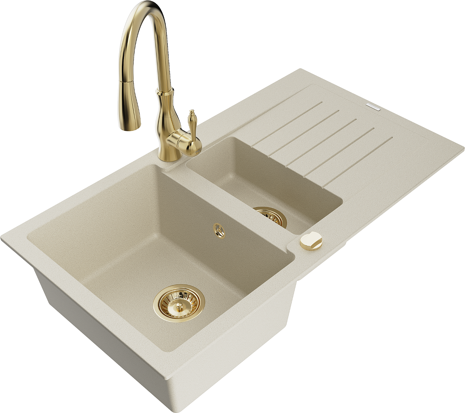 Mexen Matias zlewozmywak granitowy 1,5-komorowy z ociekaczem i baterią kuchenną Savita, beżowy - 6502-69-672601-50