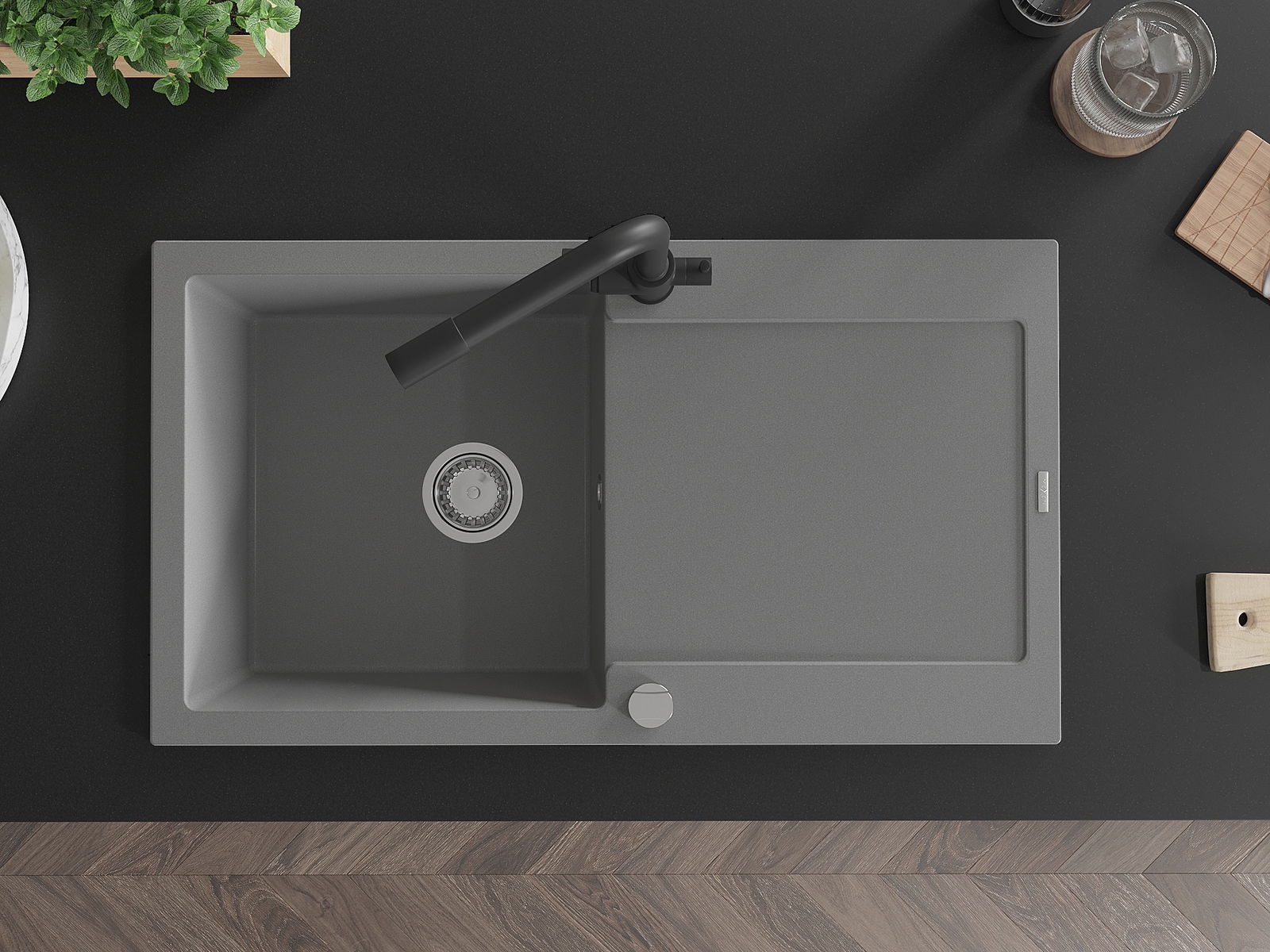 Mexen Leo zlewozmywak granitowy 1-komorowy z ociekaczem i baterią kuchenną Duero, szary - 6501-71-671600-70