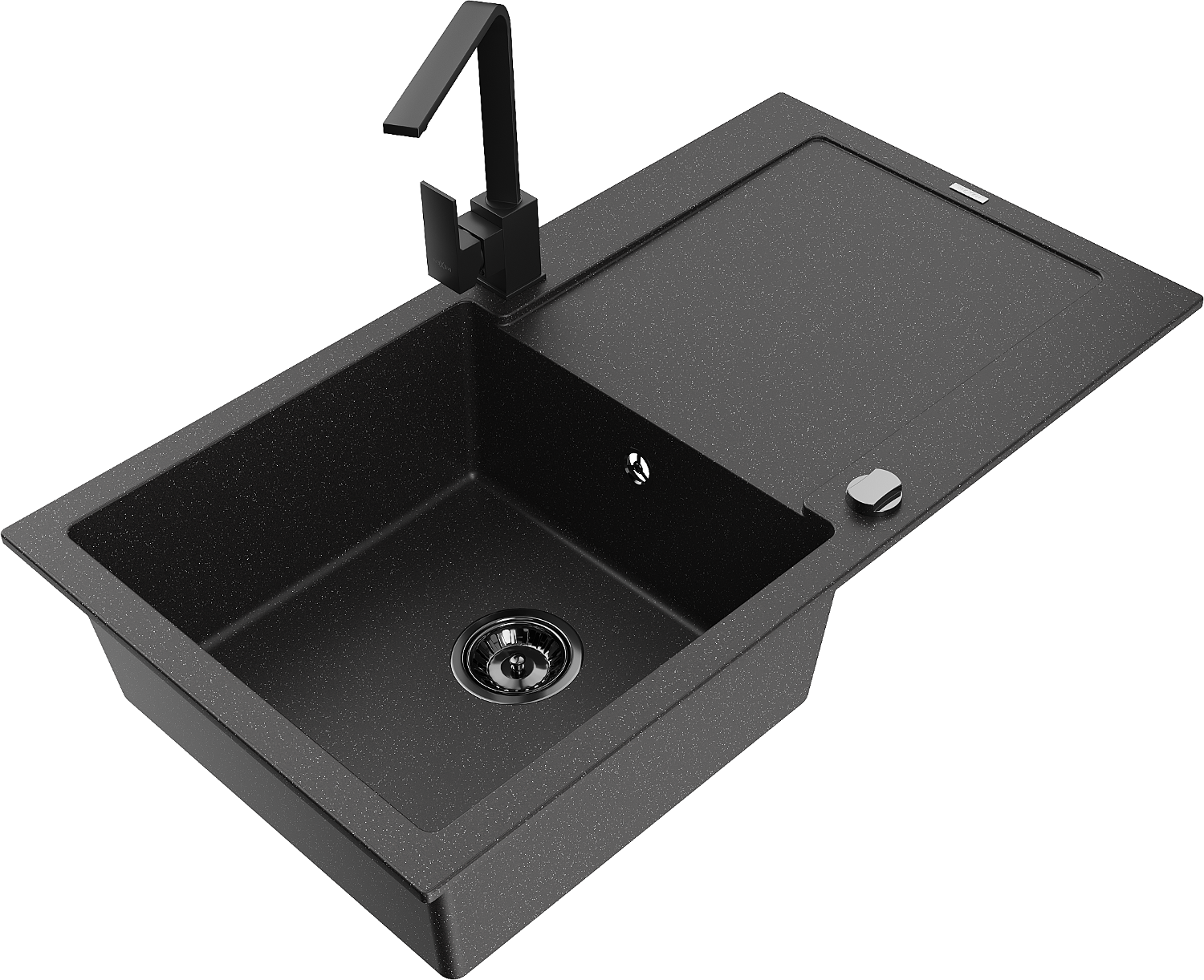 Mexen Leo zlewozmywak granitowy 1-komorowy z ociekaczem i baterią kuchenną Rita, czarny/srebrny metalik - 6501-73-670300-70-B