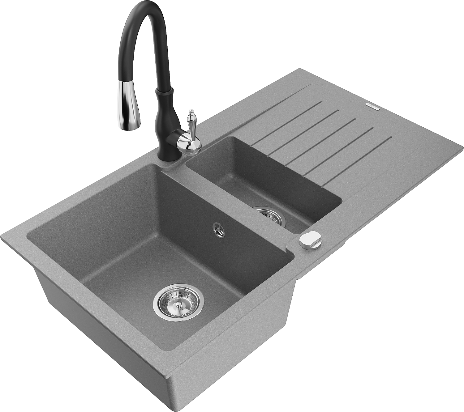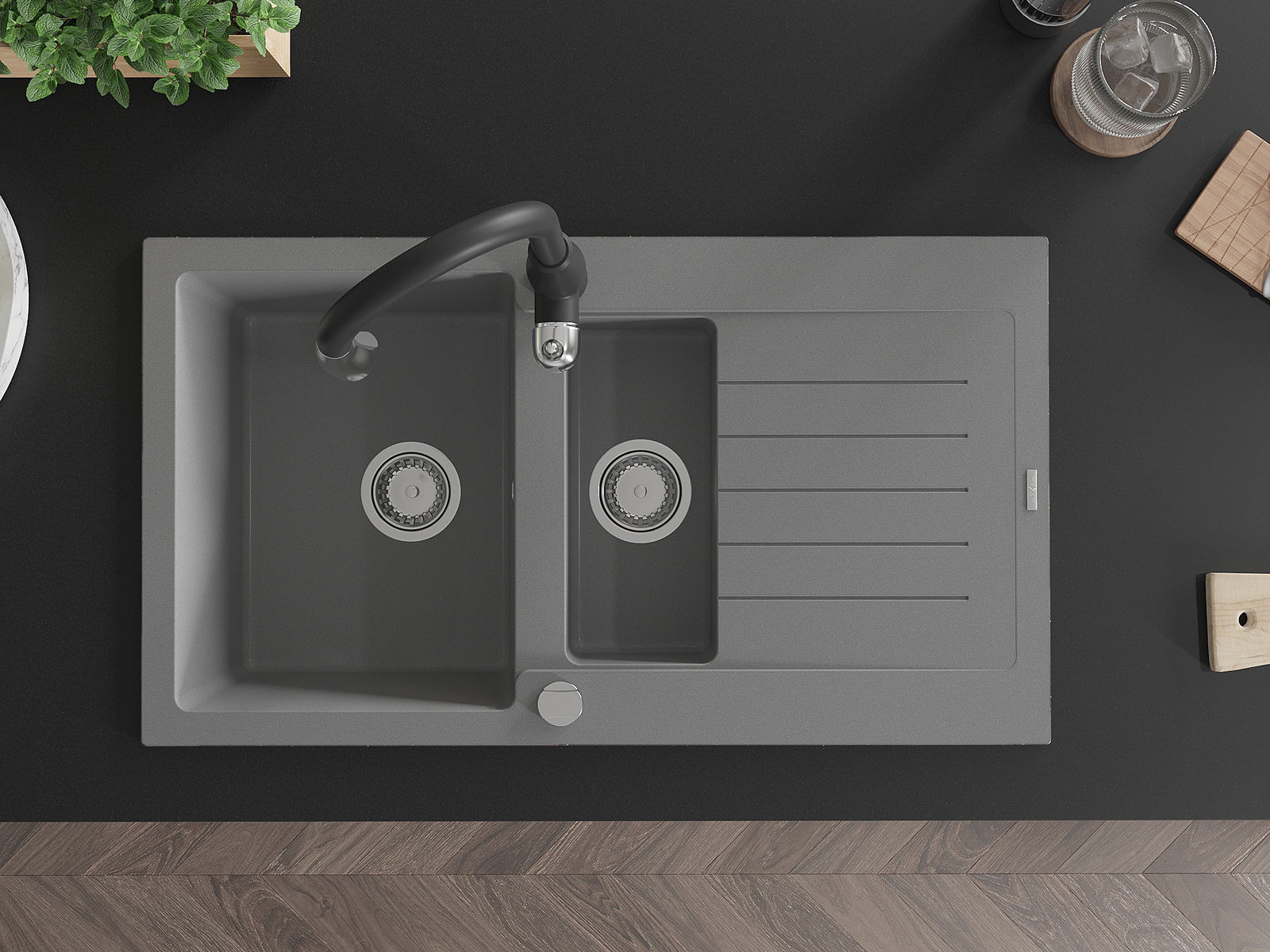 Mexen Matias zlewozmywak granitowy 1,5-komorowy z ociekaczem i baterią kuchenną Savita, szary - 6502-71-672601-70