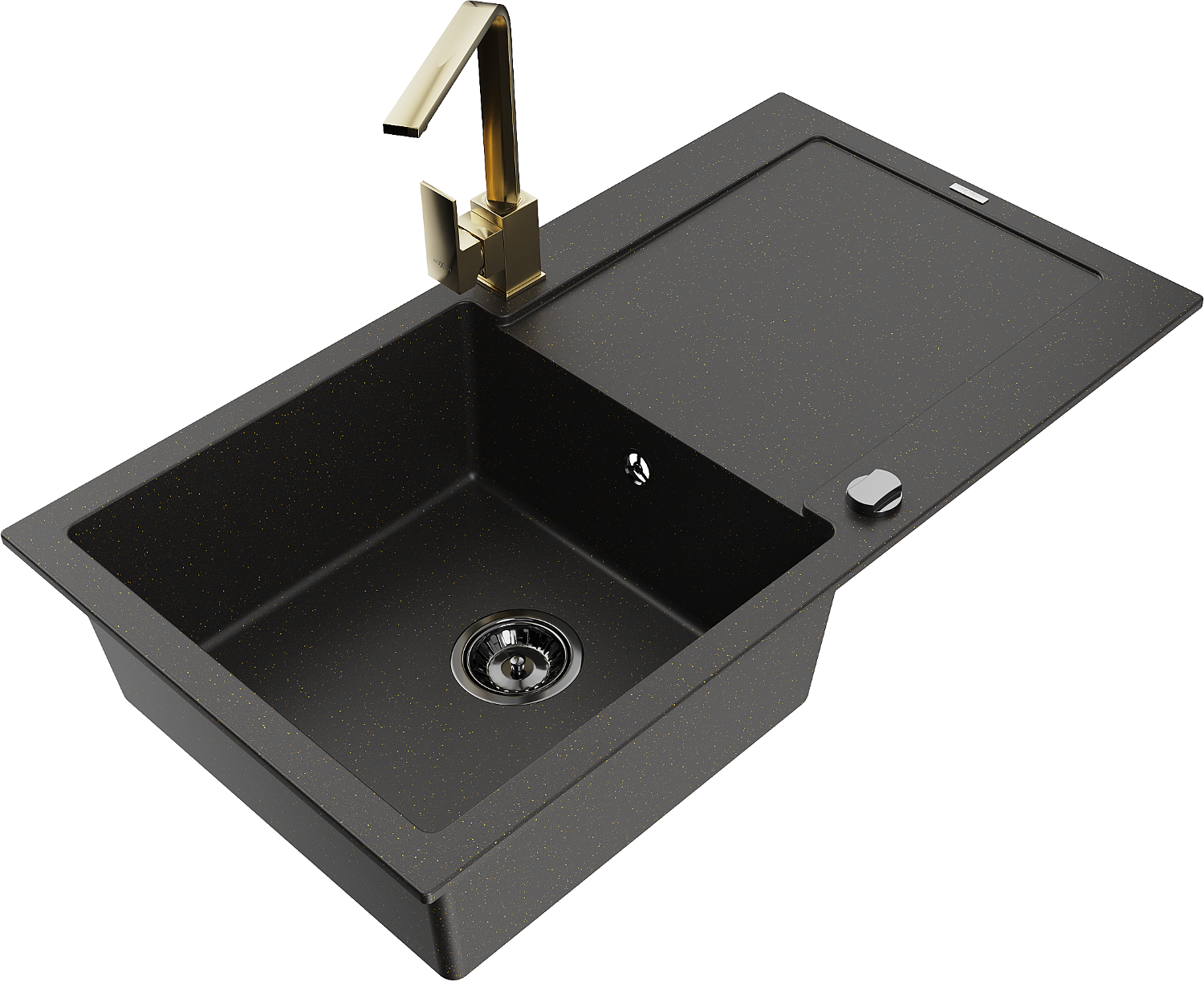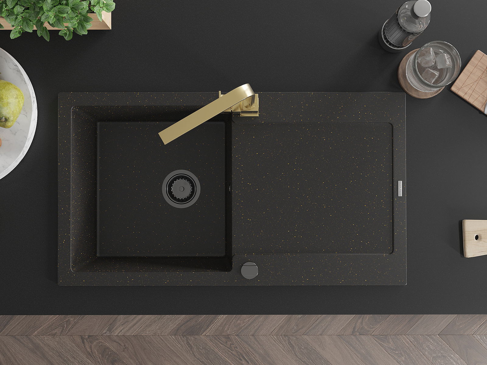Mexen Leo zlewozmywak granitowy 1-komorowy z ociekaczem i baterią kuchenną Rita, czarny/złoty metalik - 6501-75-670300-50-B