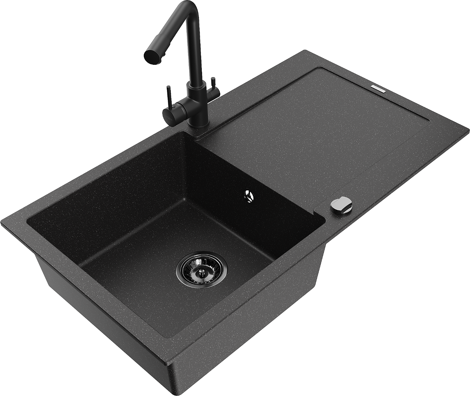 Mexen Leo zlewozmywak granitowy 1-komorowy z ociekaczem i baterią kuchenną Duero, czarny/srebrny metalik - 6501-73-671600-70-B