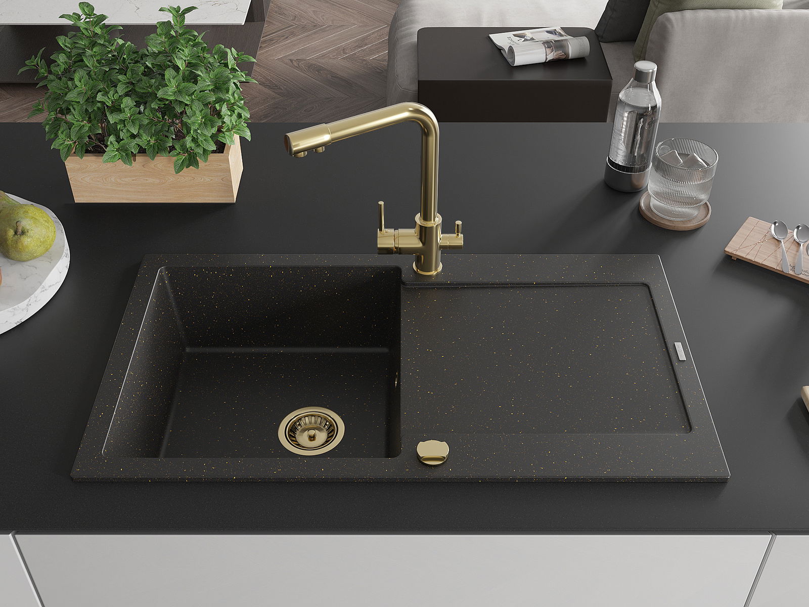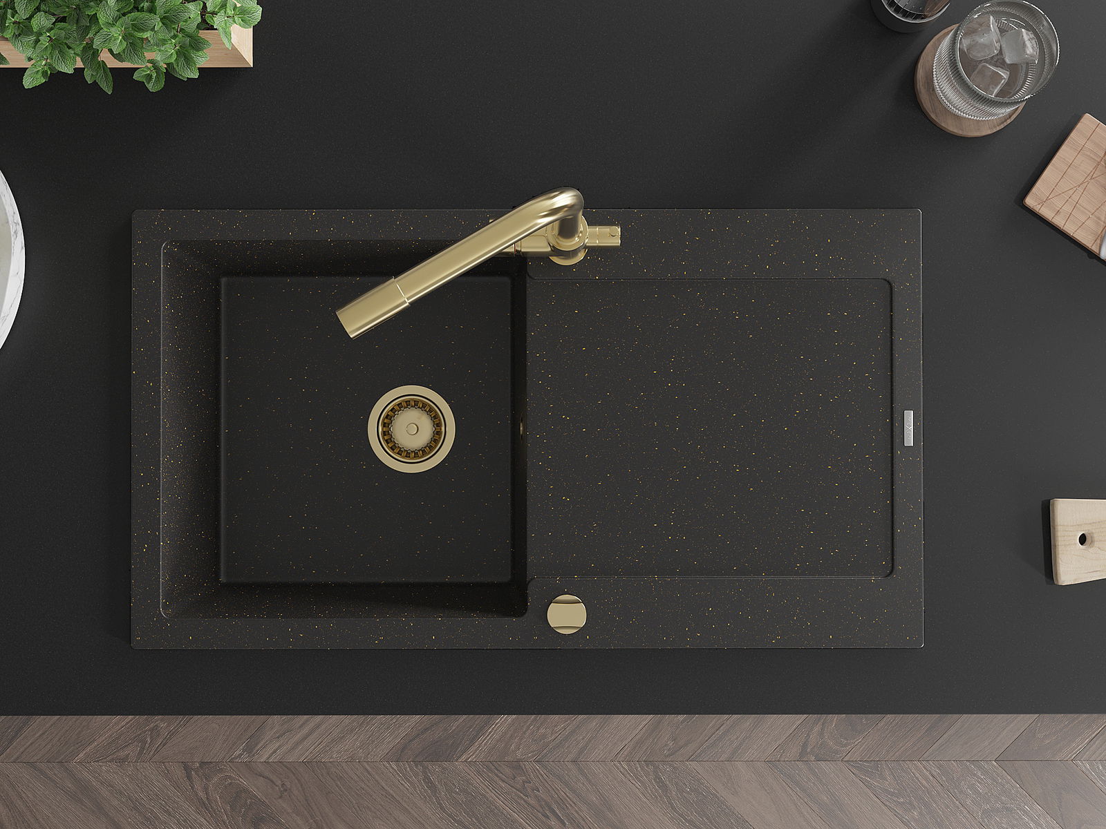 Mexen Leo zlewozmywak granitowy 1-komorowy z ociekaczem i baterią kuchenną Duero, czarny/złoty metalik - 6501-75-671600-50
