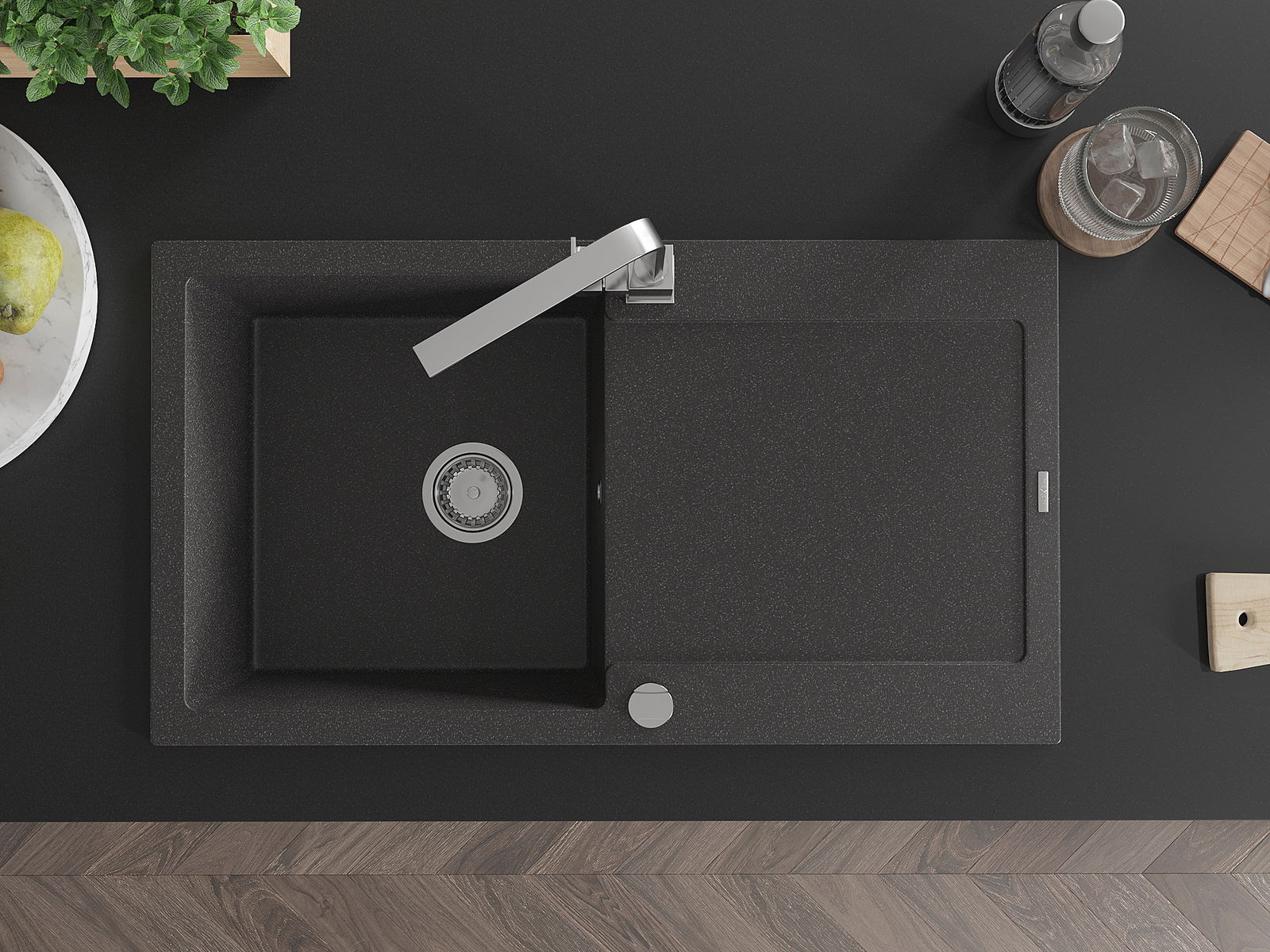 Dzięki zastosowaniu uniwersalnego systemu mocowania, zlew jest odwracalny, a ociekacz może zostać zamontowany na blacie po lewej lub prawej stronie. W ten sposób możesz z łatwością dopasować stronę do swoich potrzeb i warunków.