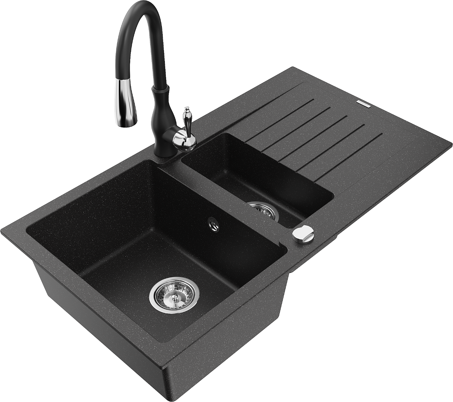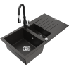 Mexen Matias zlewozmywak granitowy 1,5-komorowy z ociekaczem i baterią kuchenną Savita, czarny/srebrny - 6502-73-672601-70