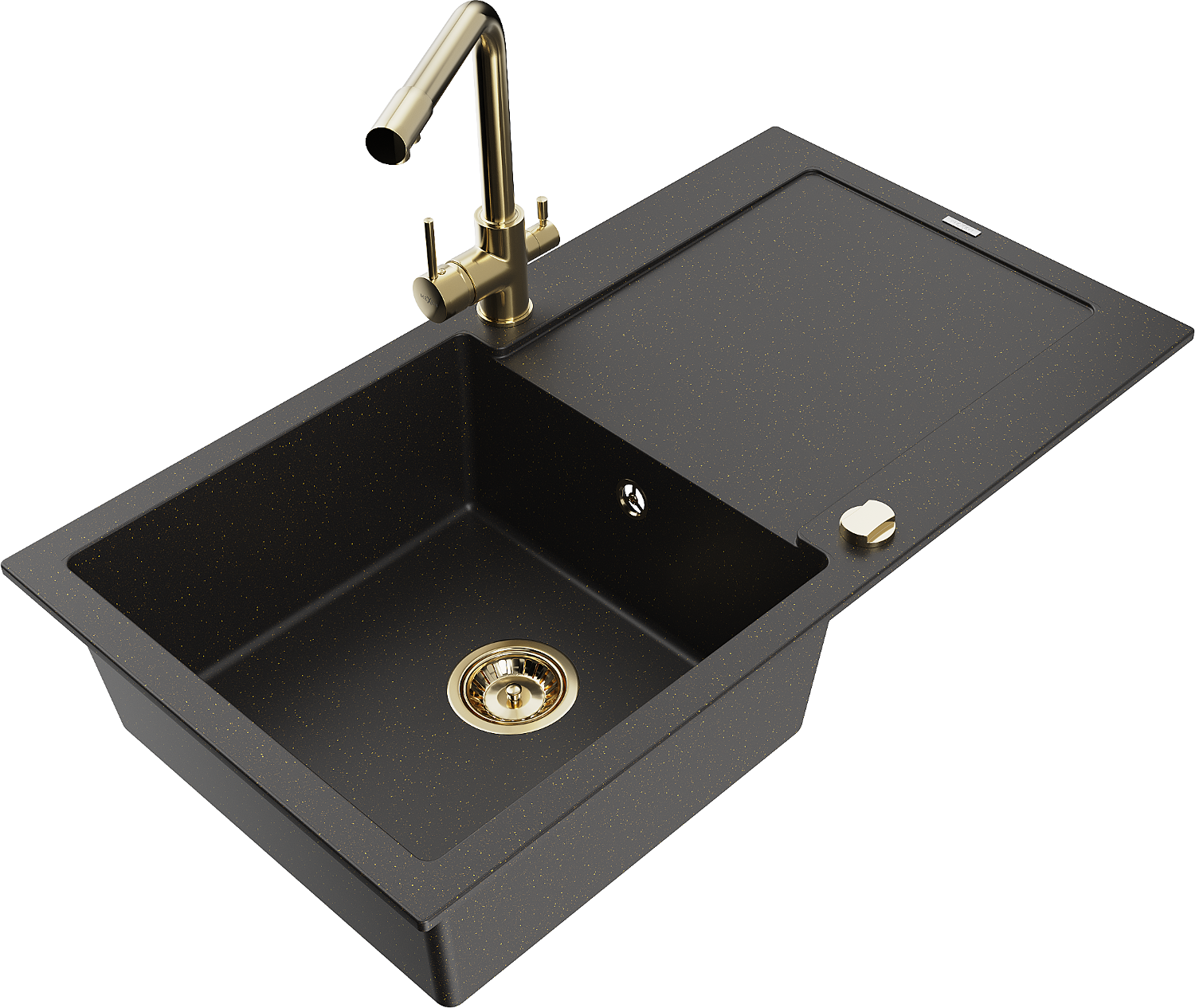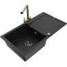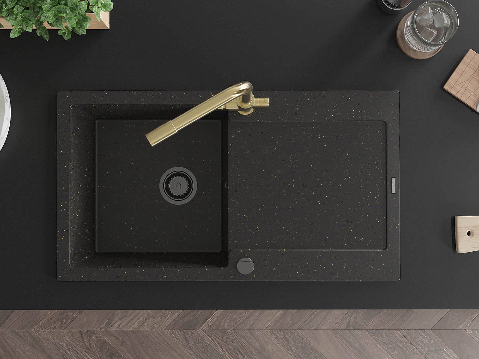 Mexen Leo zlewozmywak granitowy 1-komorowy z ociekaczem i baterią kuchenną Duero, czarny/złoty metalik - 6501-75-671600-50-B