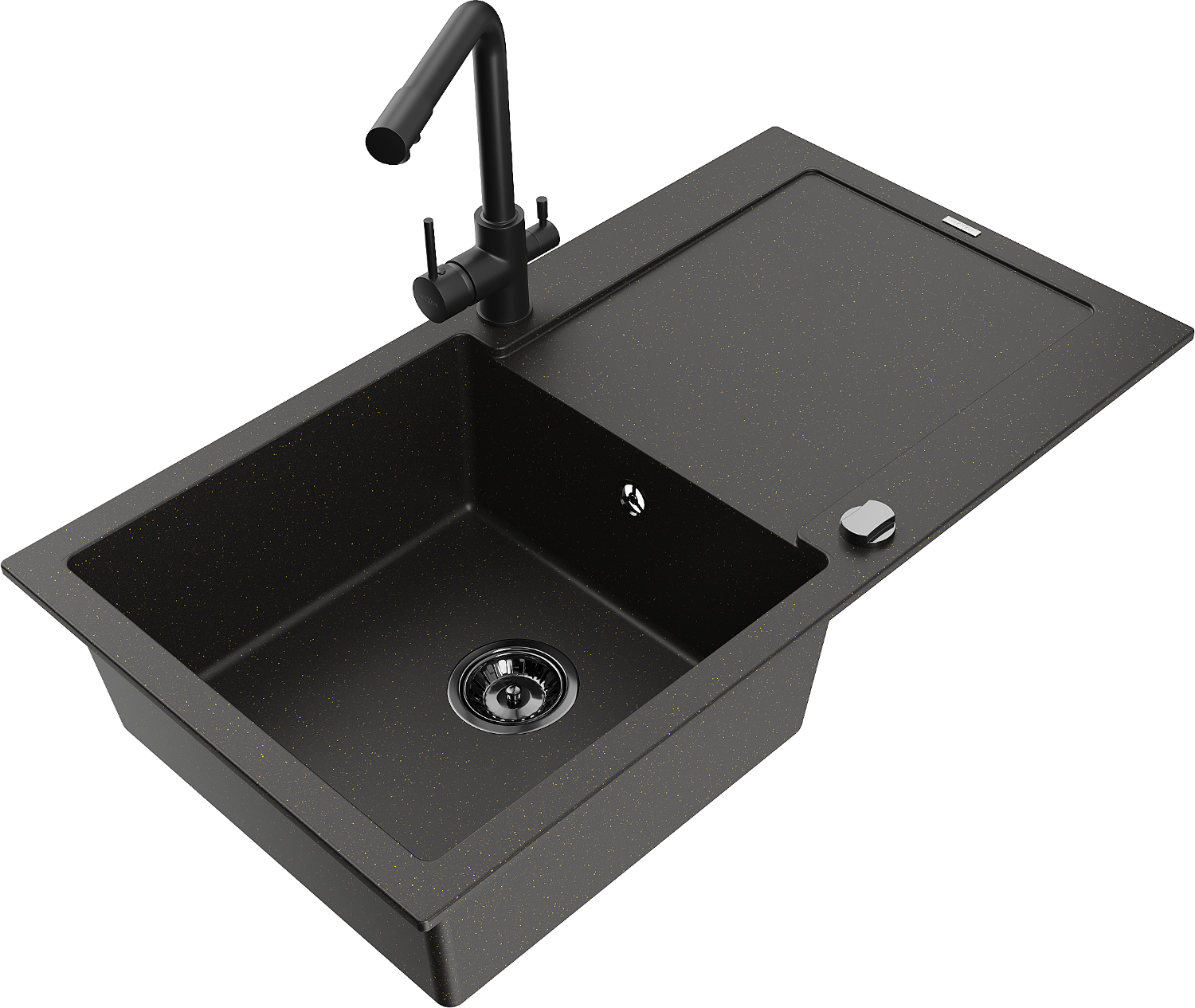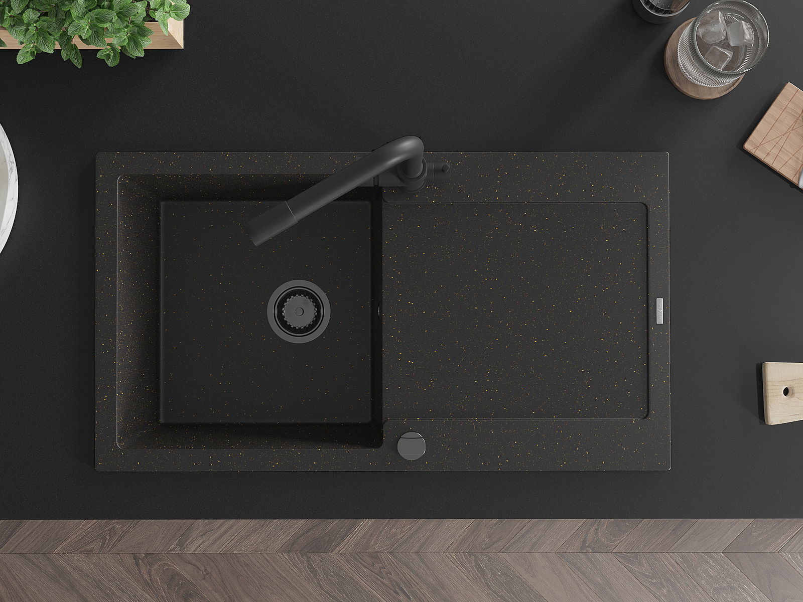 Mexen Leo zlewozmywak granitowy 1-komorowy z ociekaczem i baterią kuchenną Duero, czarny/złoty metalik - 6501-75-671600-70-B