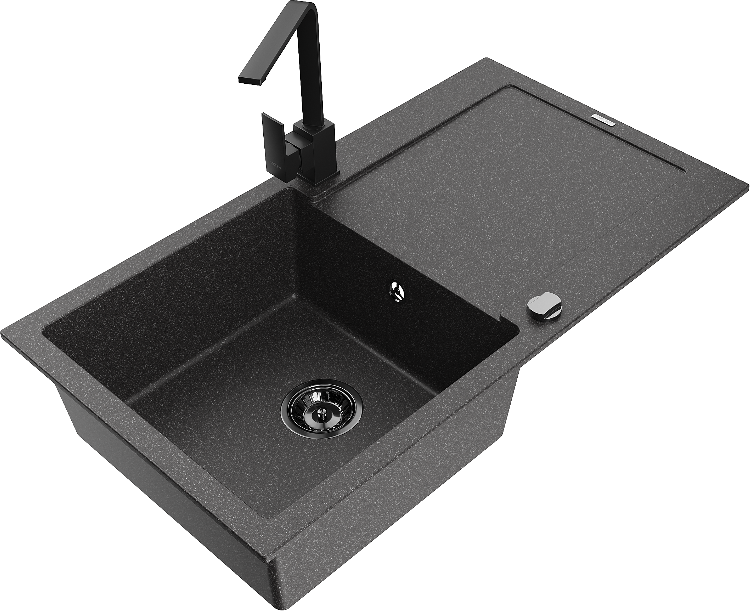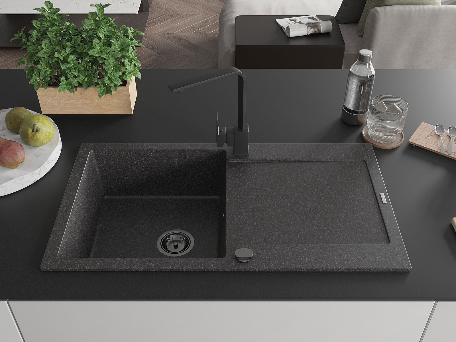 Mexen Leo zlewozmywak granitowy 1-komorowy z ociekaczem i baterią kuchenną Rita, czarny nakrapiany - 6501-76-670300-70-B