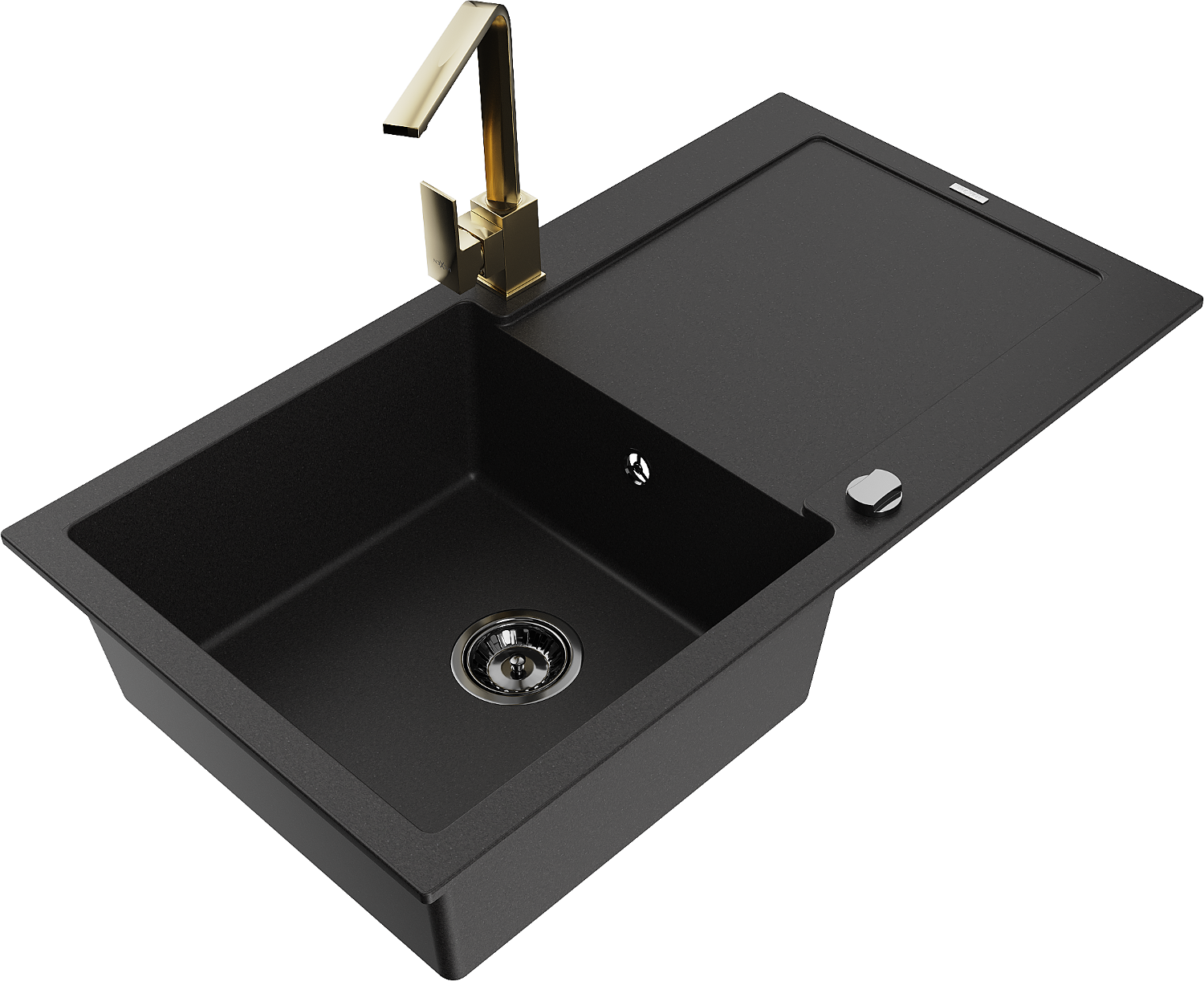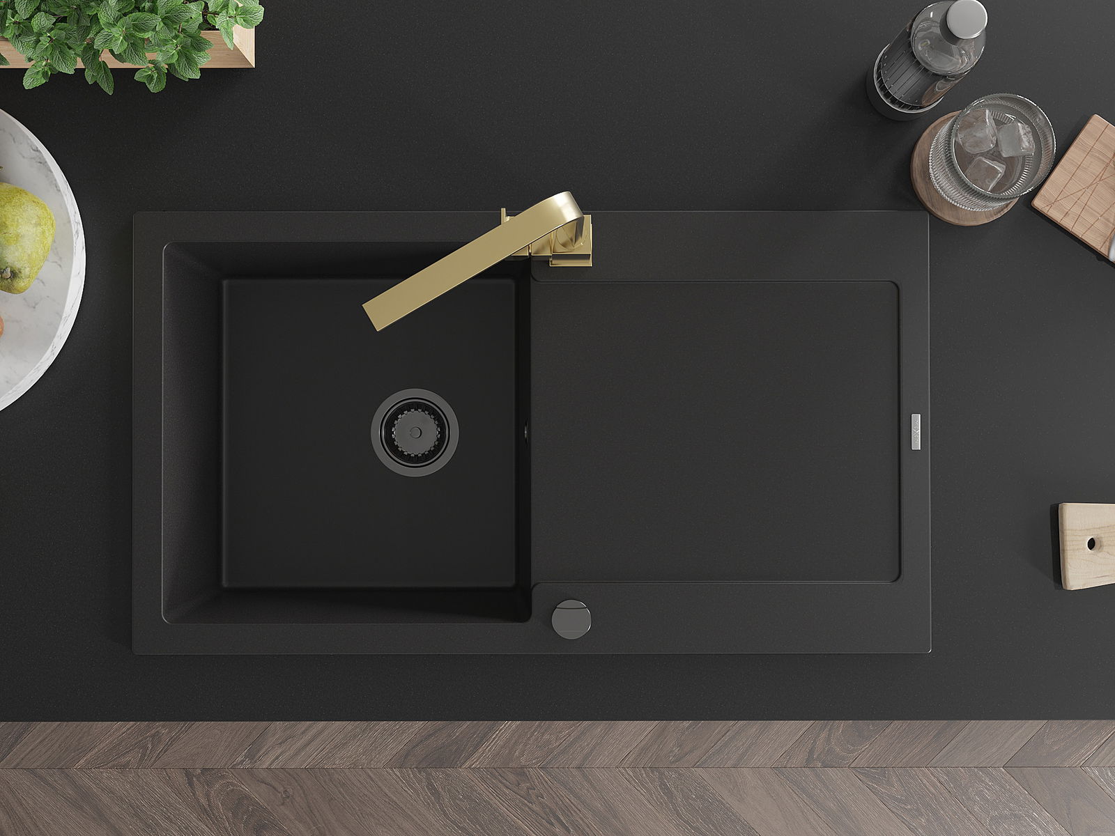 Mexen Leo zlewozmywak granitowy 1-komorowy z ociekaczem i baterią kuchenną Rita, czarny - 6501-77-670300-50-B