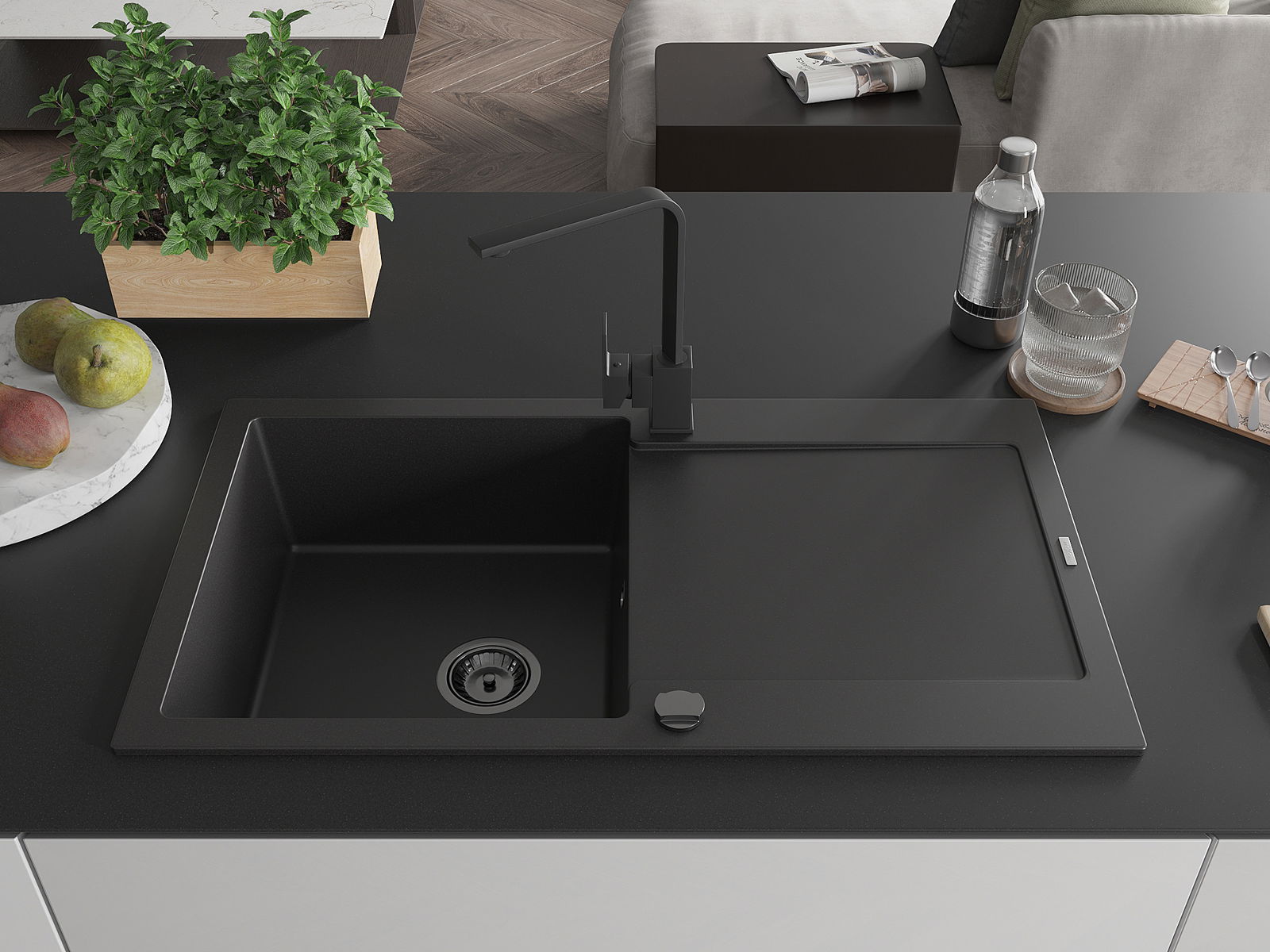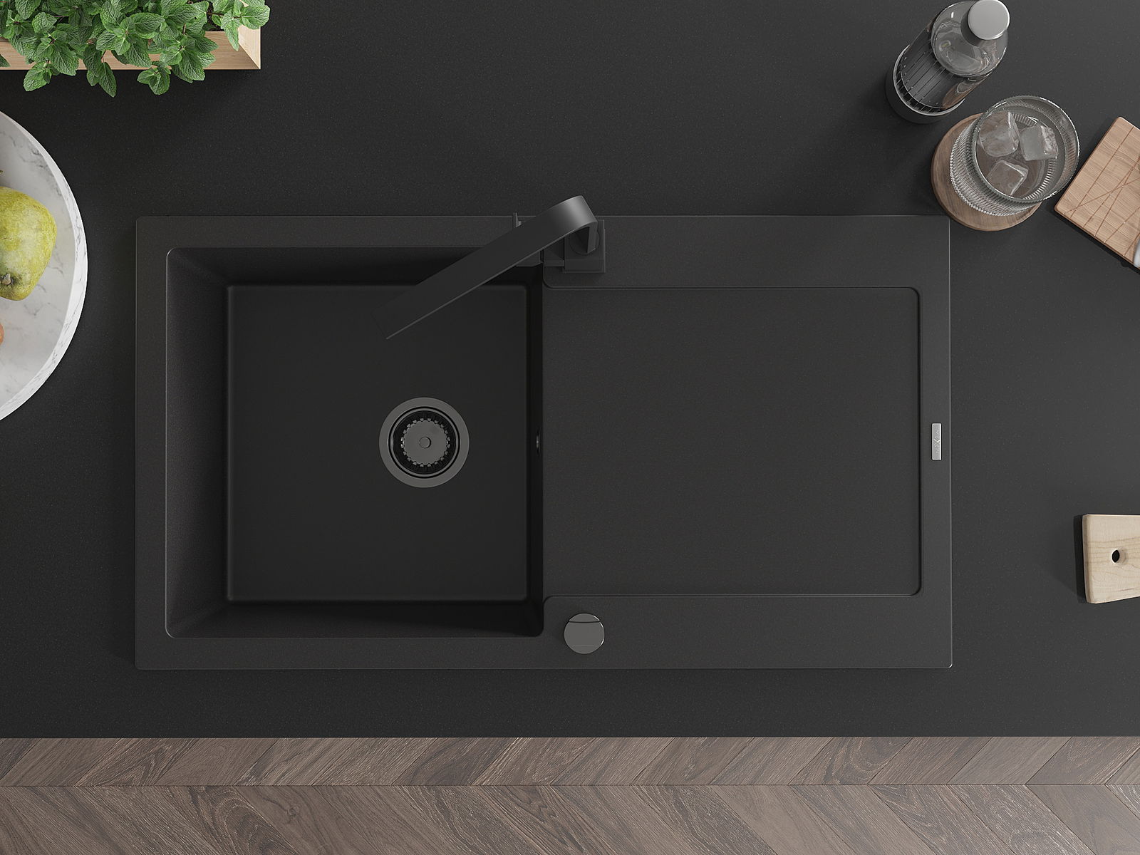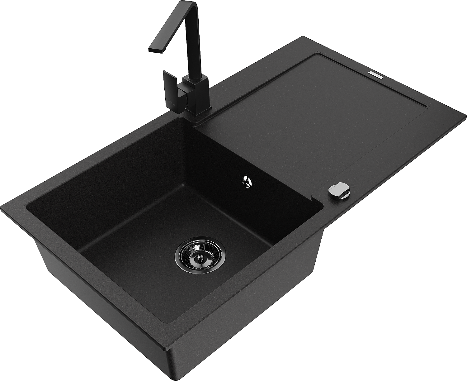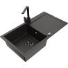 Mexen Leo zlewozmywak granitowy 1-komorowy z ociekaczem i baterią kuchenną Rita, czarny - 6501-77-670300-70-B