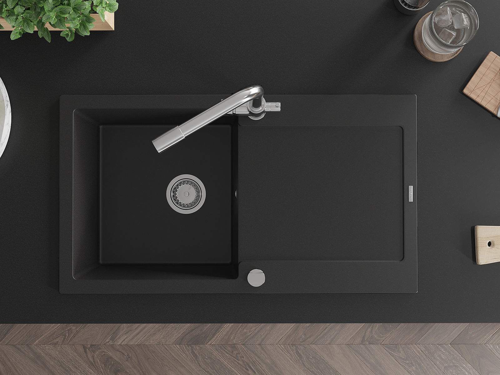 Dzięki zastosowaniu uniwersalnego systemu mocowania, zlew jest odwracalny, a ociekacz może zostać zamontowany na blacie po lewej lub prawej stronie. W ten sposób możesz z łatwością dopasować stronę do swoich potrzeb i warunków.