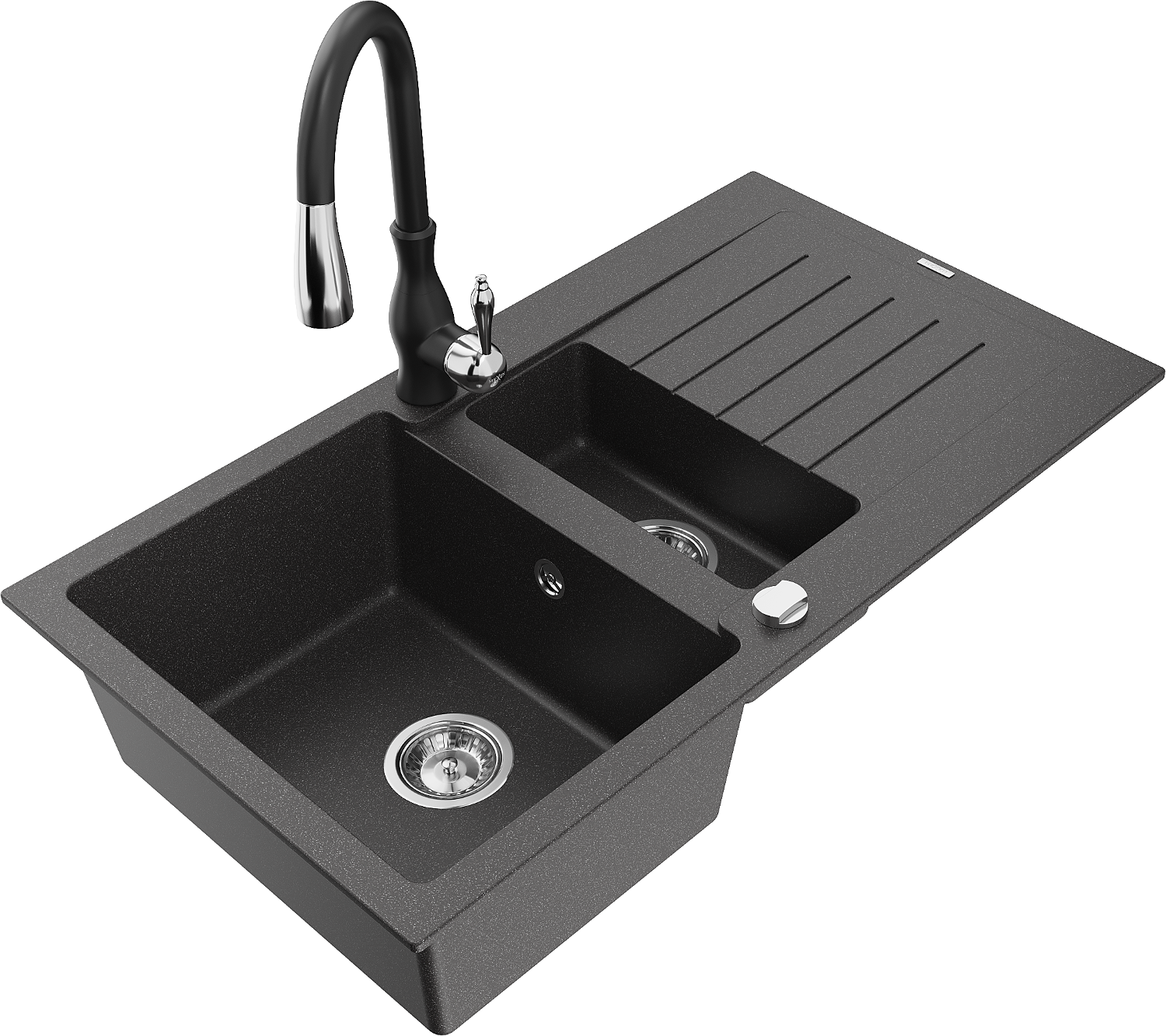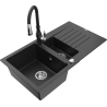 Mexen Matias zlewozmywak granitowy 1,5-komorowy z ociekaczem i baterią kuchenną Savita, czarny nakrapiany - 6502-76-672601-70