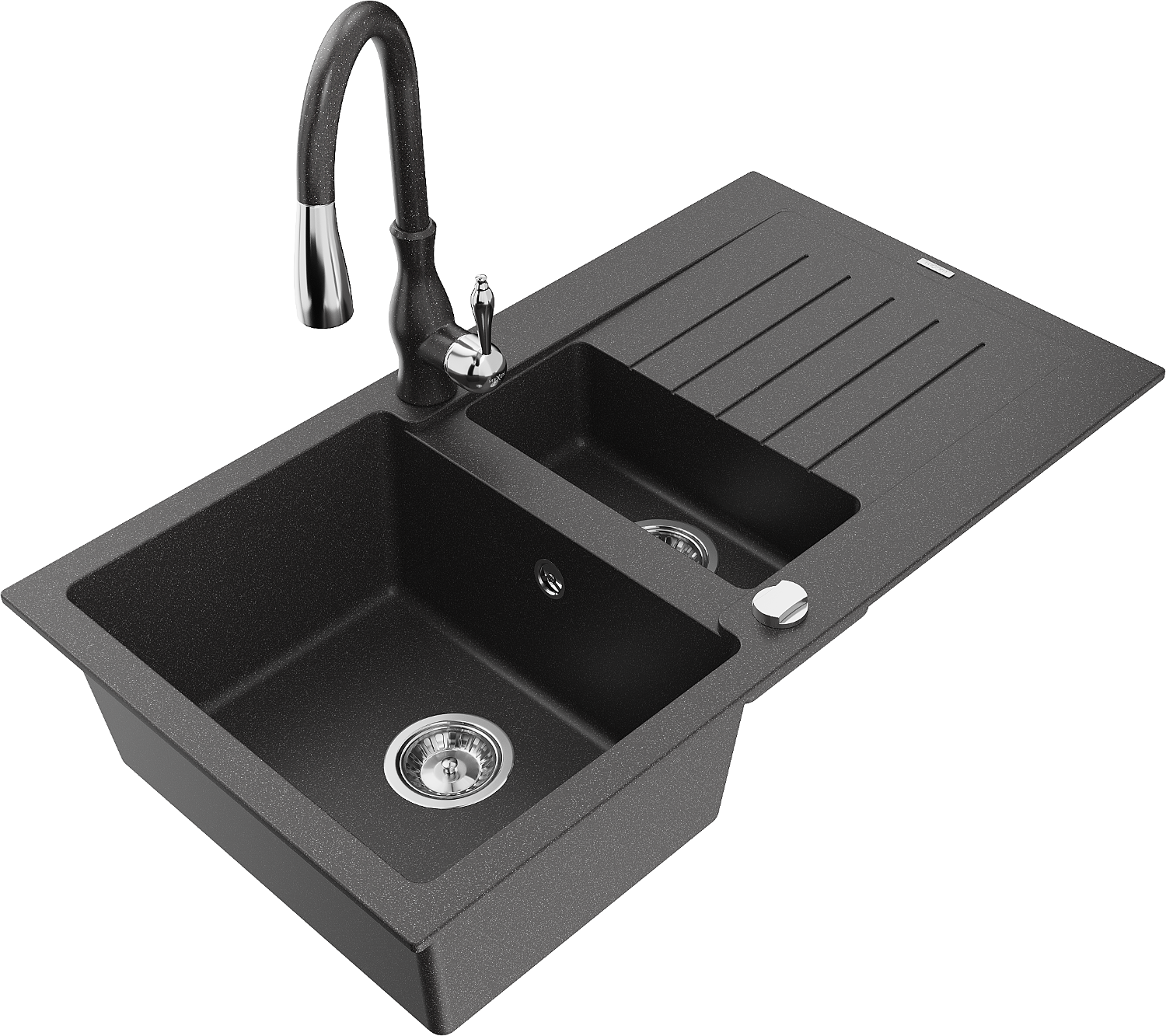 Mexen Matias zlewozmywak granitowy 1,5-komorowy z ociekaczem i baterią kuchenną Savita, czarny nakrapiany - 6502-76-672601-76
