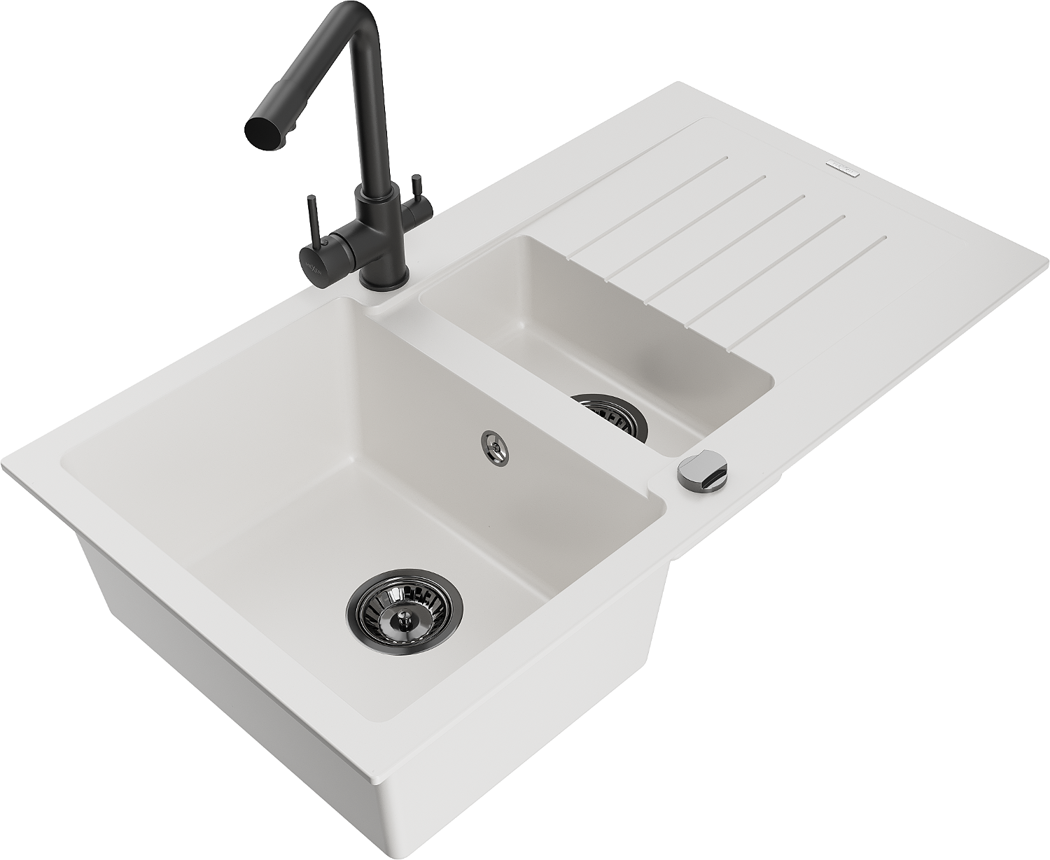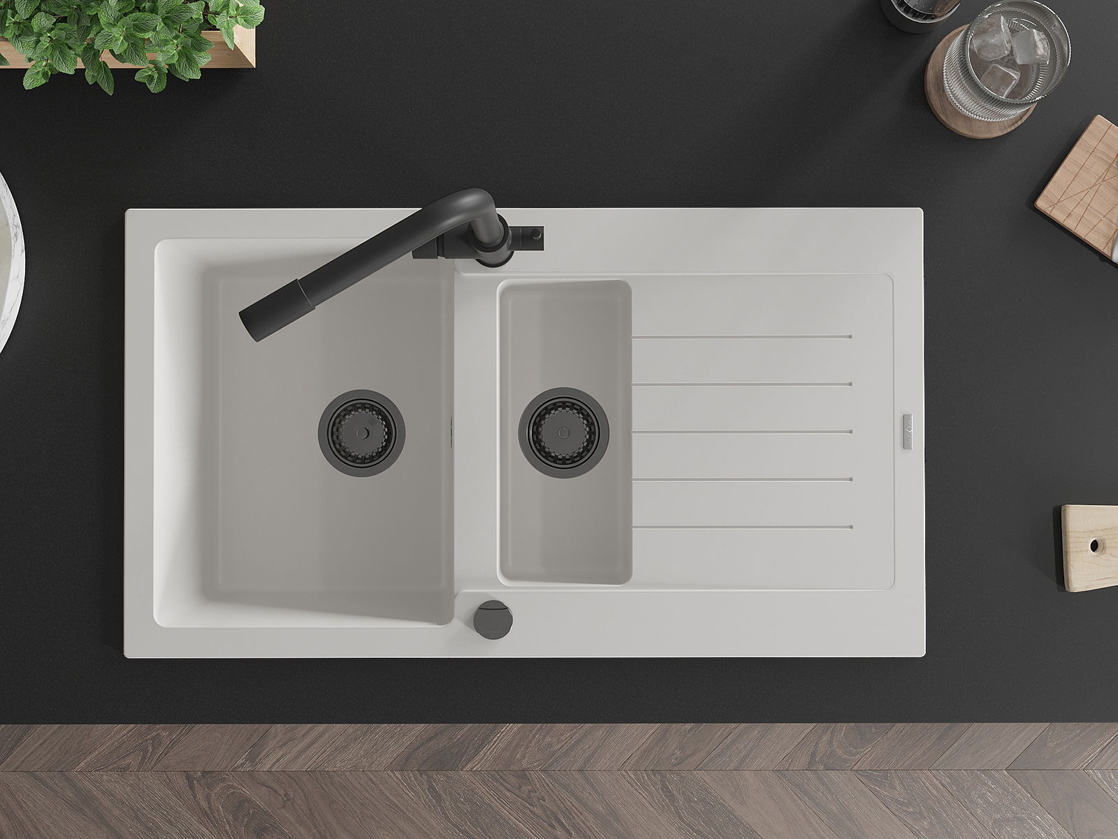 Mexen Matias zlewozmywak granitowy 1,5-komorowy z ociekaczem i baterią kuchenną Duero, biały - 6502-20-671600-70