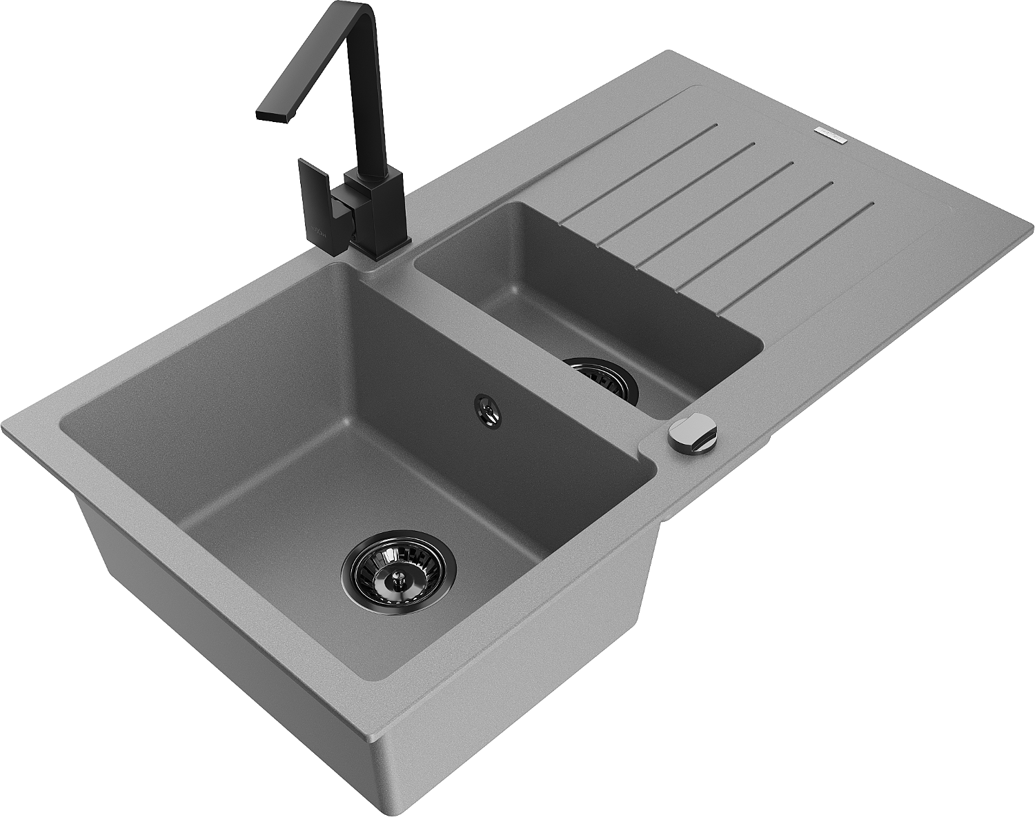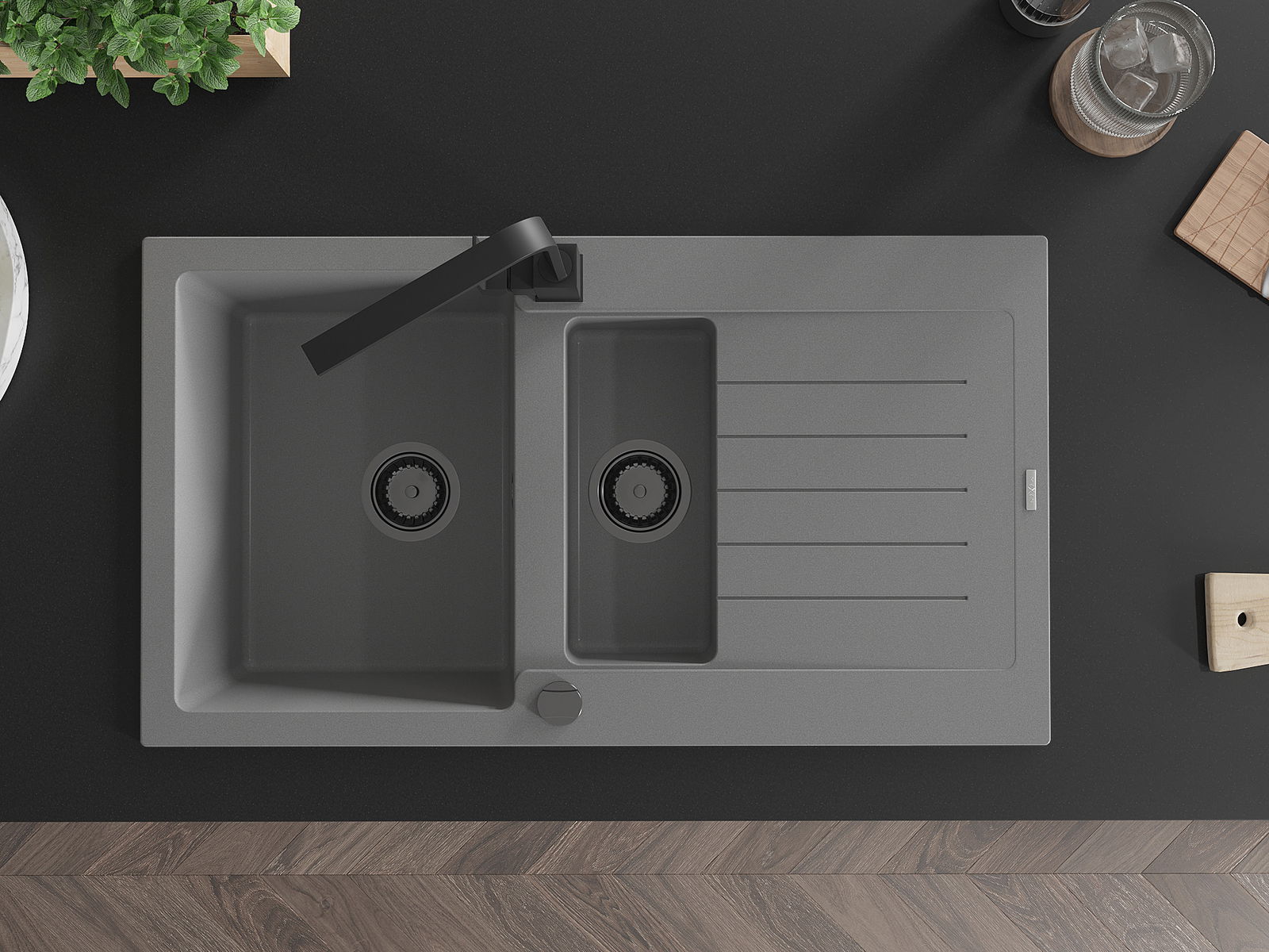 Mexen Matias zlewozmywak granitowy 1,5-komorowy z ociekaczem i baterią kuchenną Rita, szary - 6502-71-670300-70-B