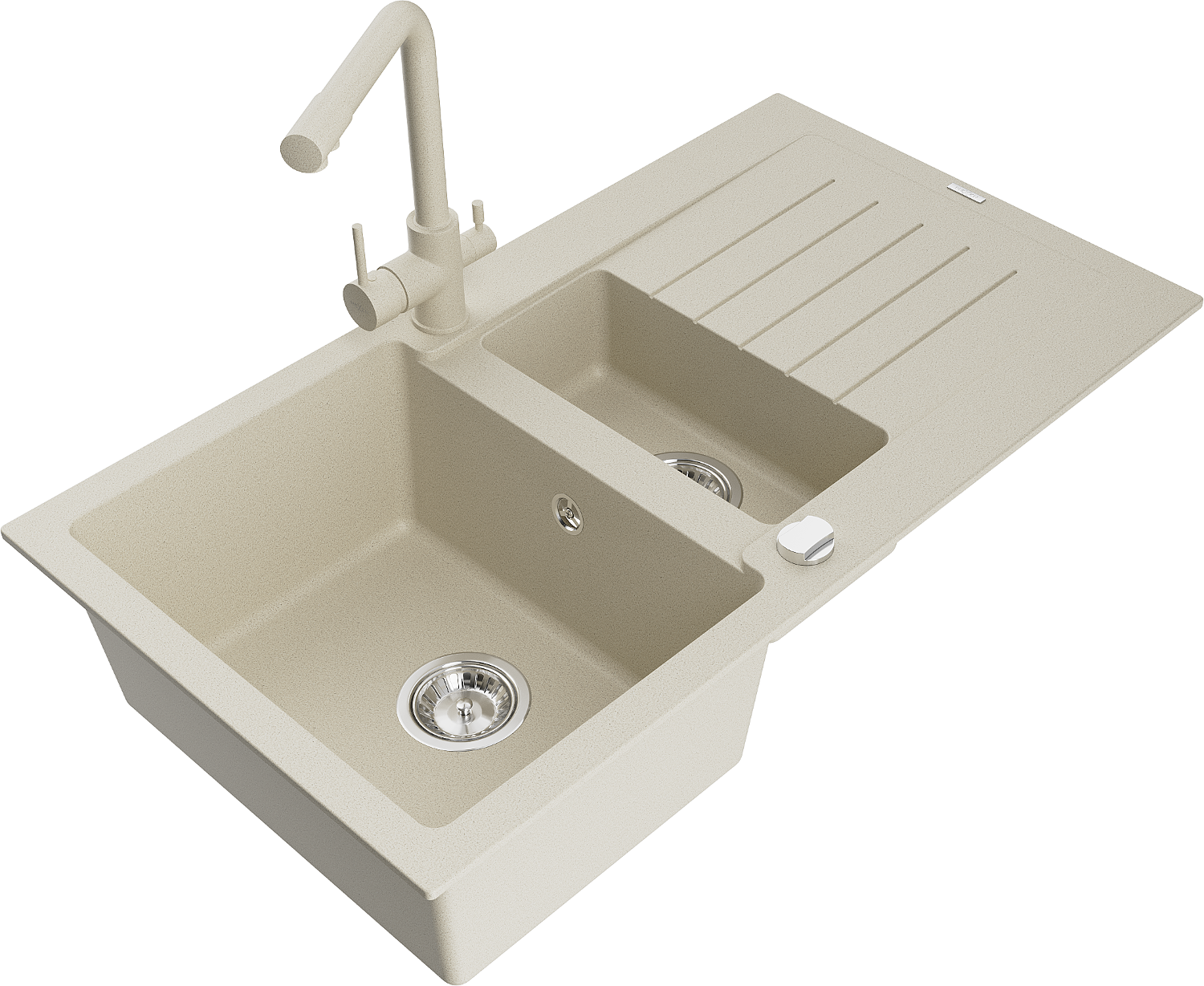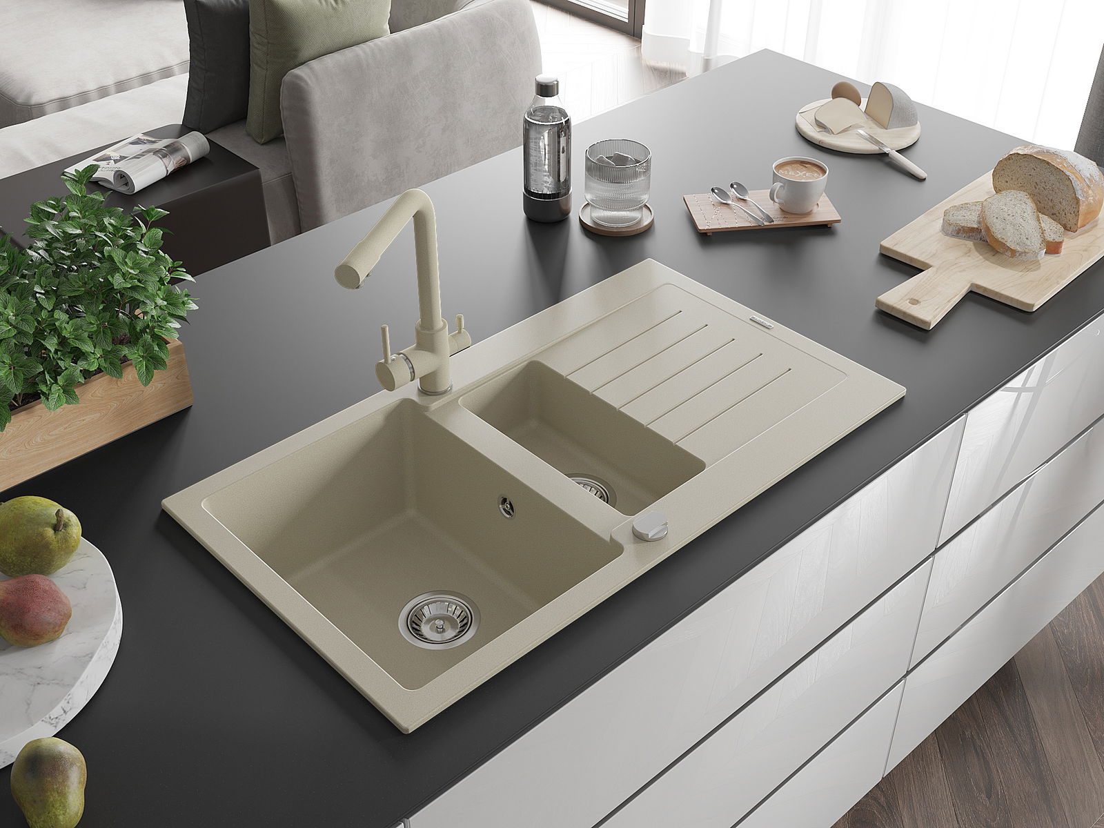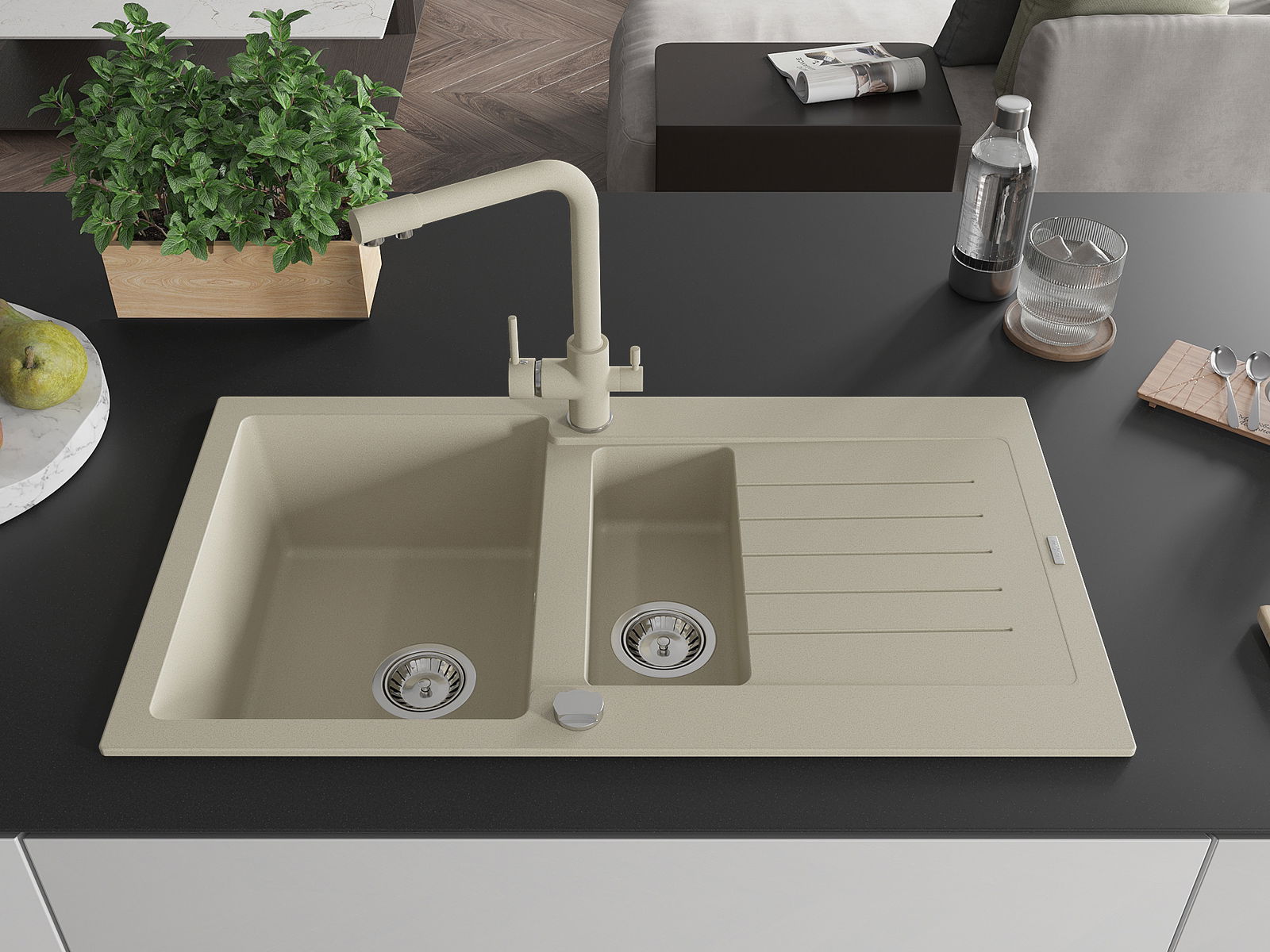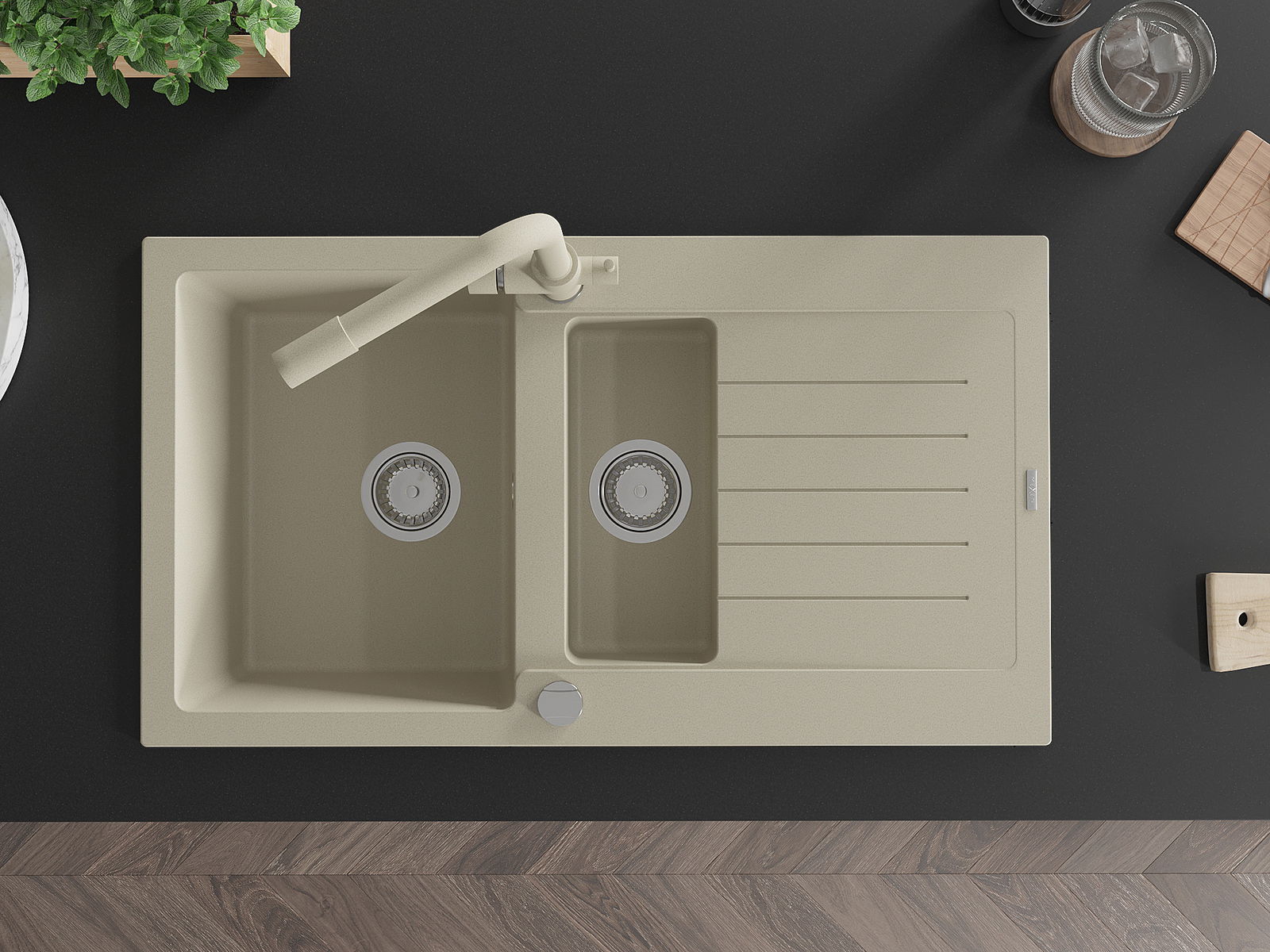 Mexen Matias zlewozmywak granitowy 1,5-komorowy z ociekaczem i baterią kuchenną Duero, beżowy - 6502-69-671600-69