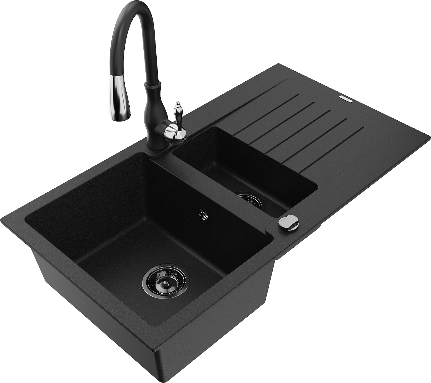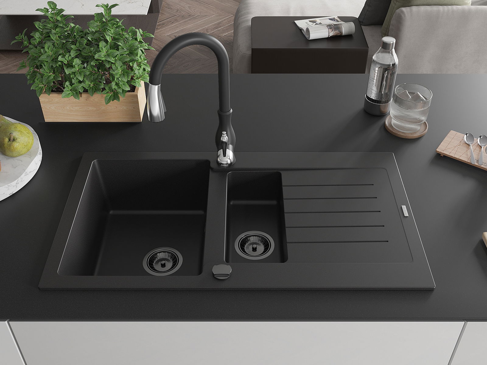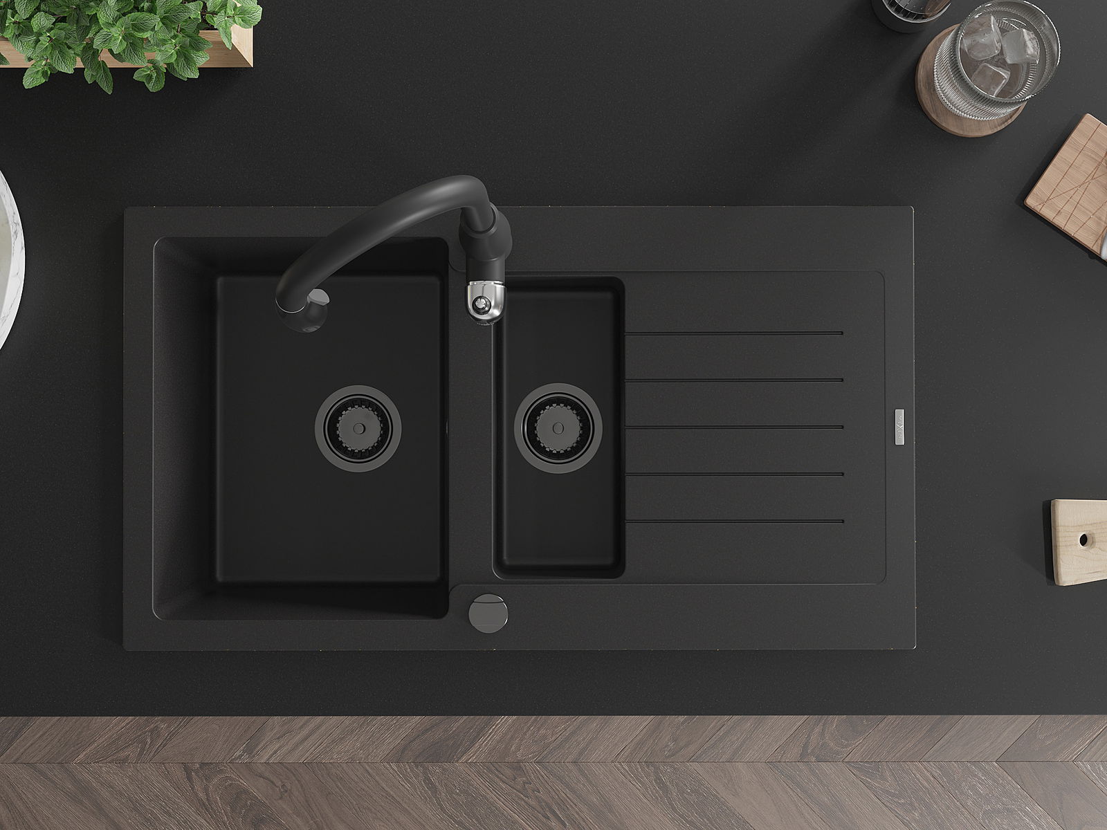 Mexen Matias zlewozmywak granitowy 1,5-komorowy z ociekaczem i baterią kuchenną Savita, czarny - 6502-77-672601-70-B