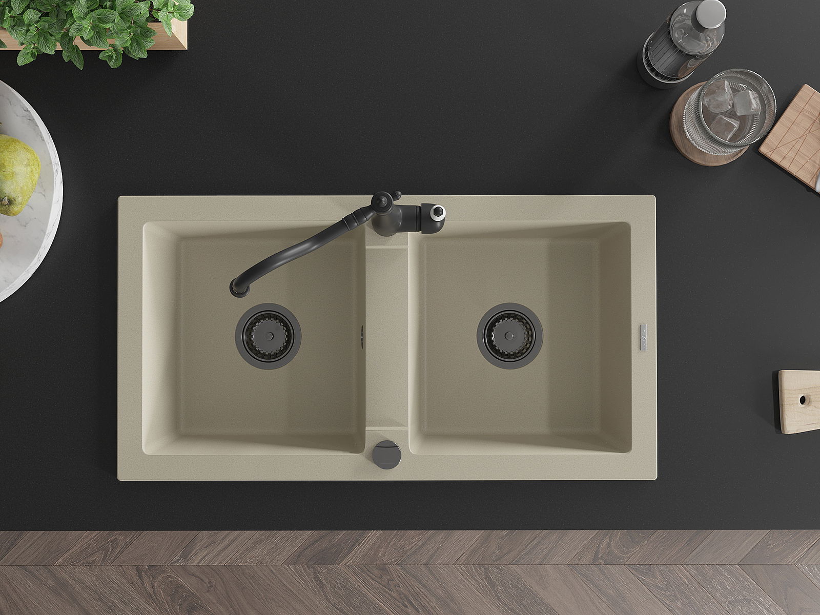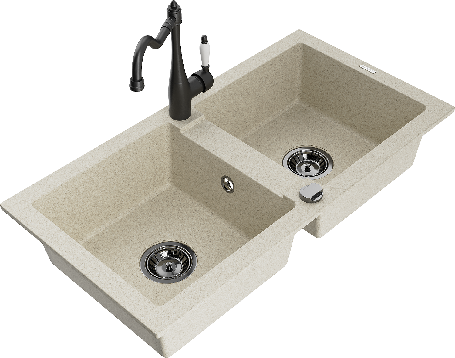 Mexen Mario zlewozmywak granitowy 2-komorowy z baterią kuchenną Carla, beżowy - 6504-69-670700-70