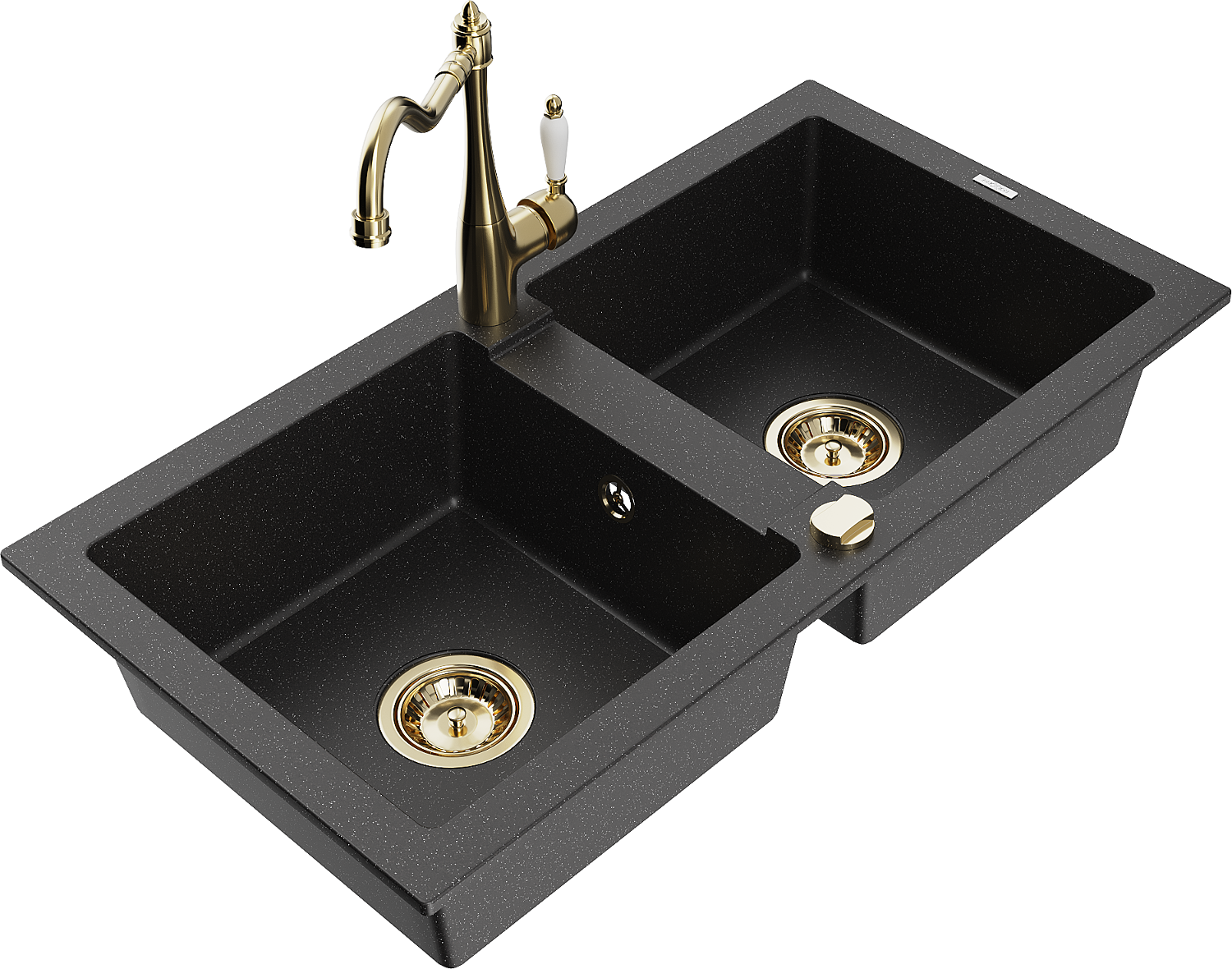 Mexen Mario zlewozmywak granitowy 2-komorowy z baterią kuchenną Carla, czarny/srebrny metalik - 6504-73-670700-50