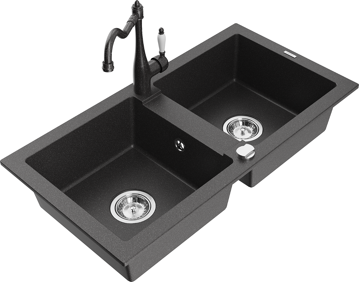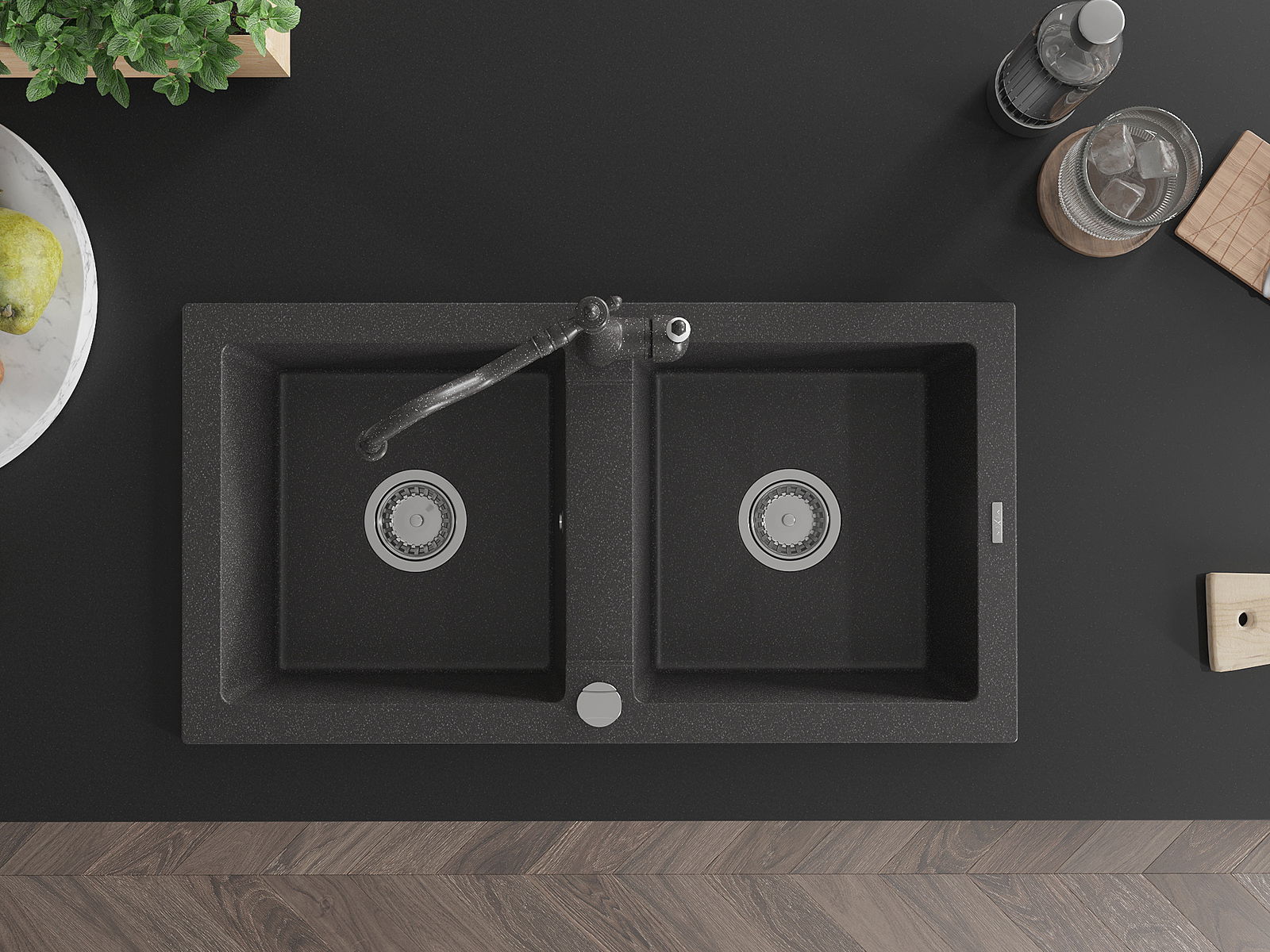 Mexen Mario zlewozmywak granitowy 2-komorowy z baterią kuchenną Carla, czarny nakrapiany - 6504-76-670700-76