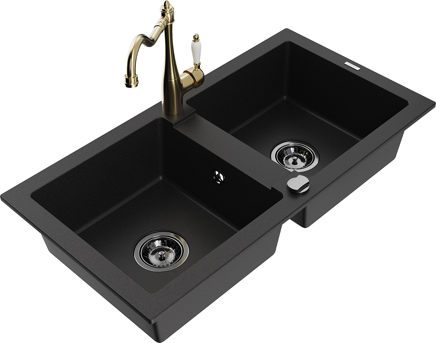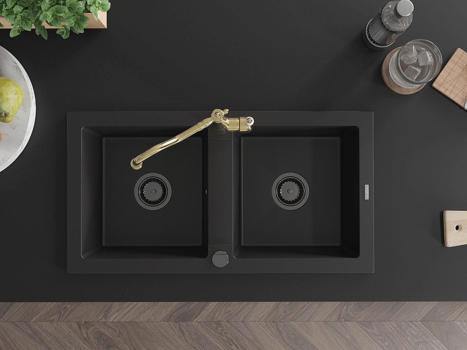 Mexen Mario zlewozmywak granitowy 2-komorowy z baterią kuchenną Carla, czarny - 6504-77-670700-50-B