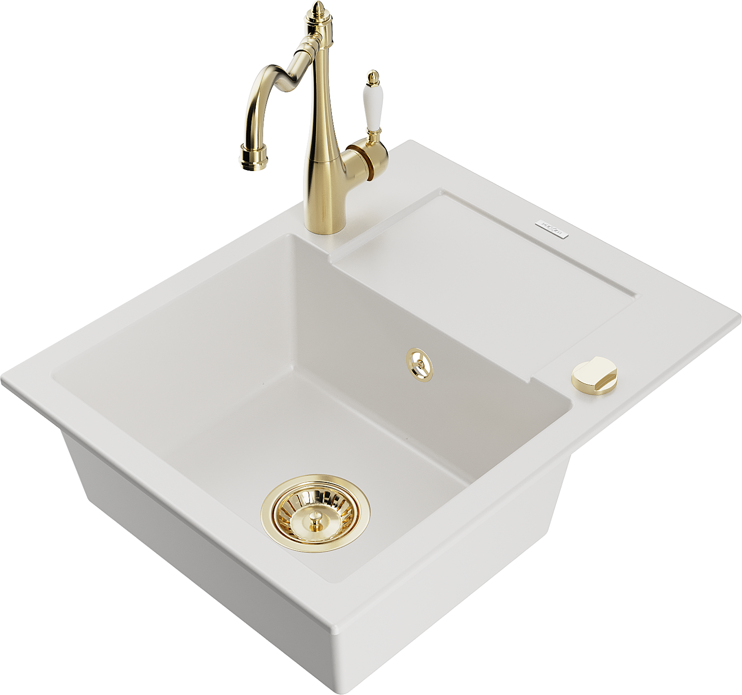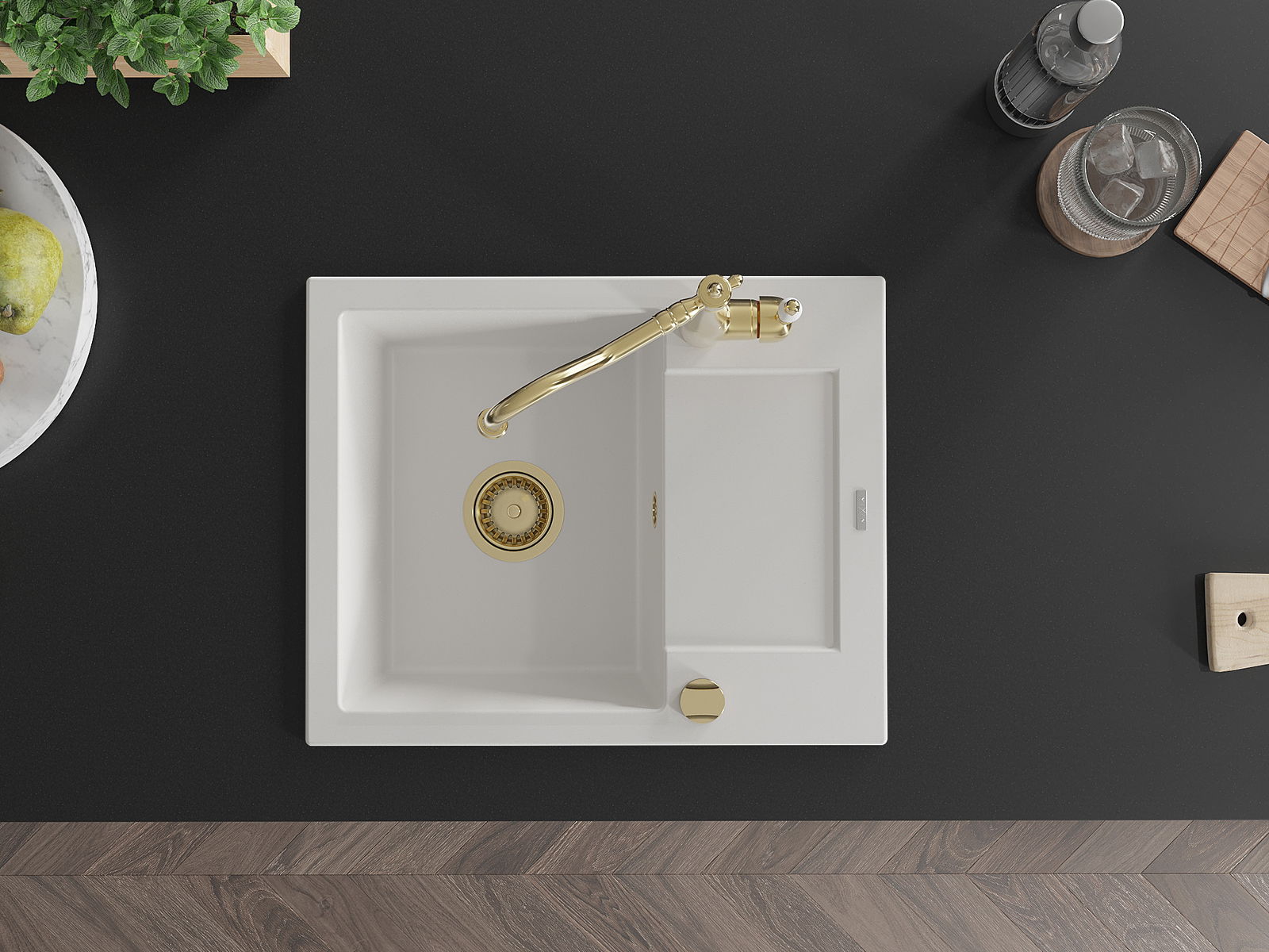 Mexen Enzo zlewozmywak granitowy 1-komorowy z ociekaczem i baterią kuchenną Carla, biały - 6506-20-670700-50