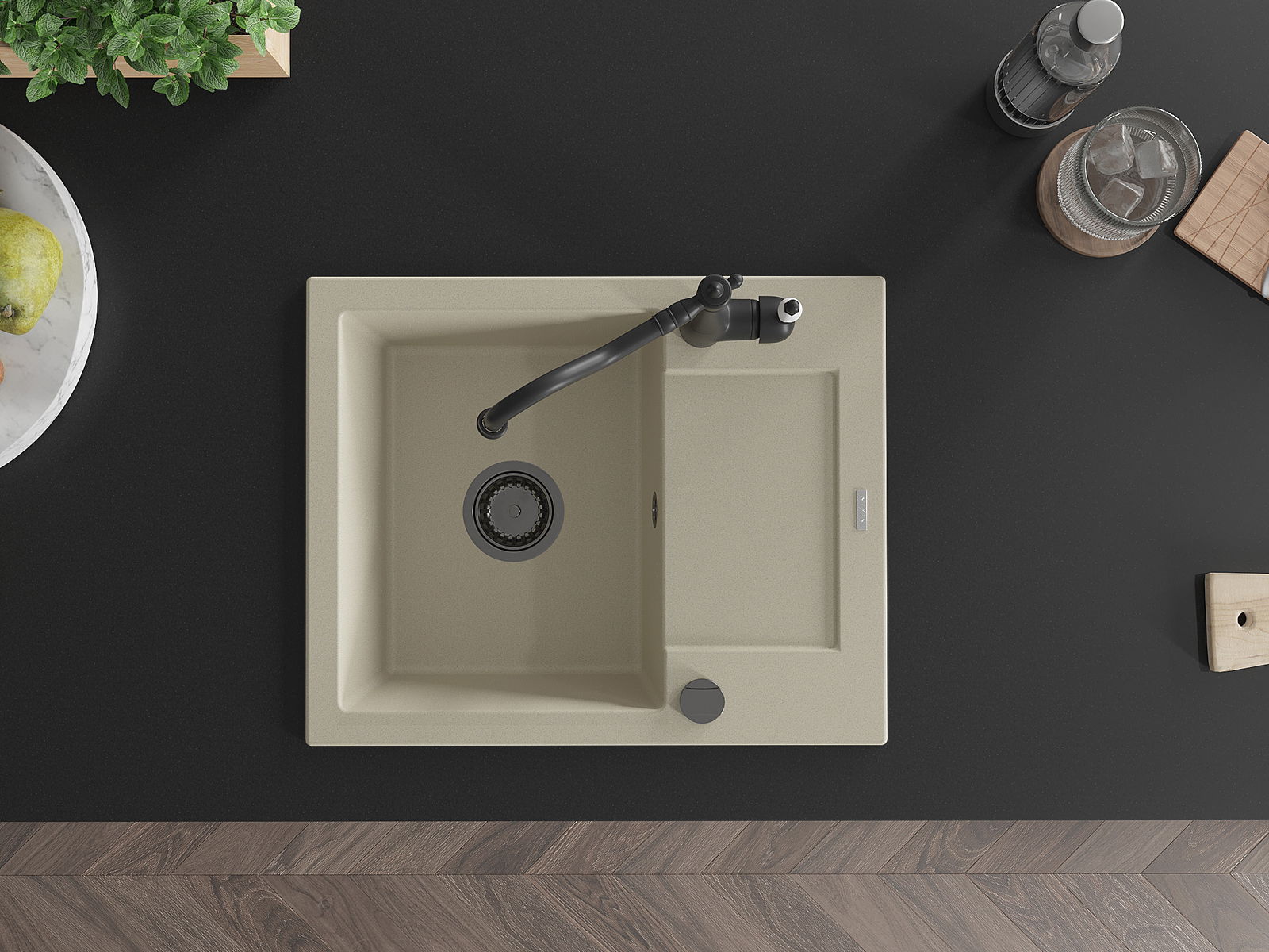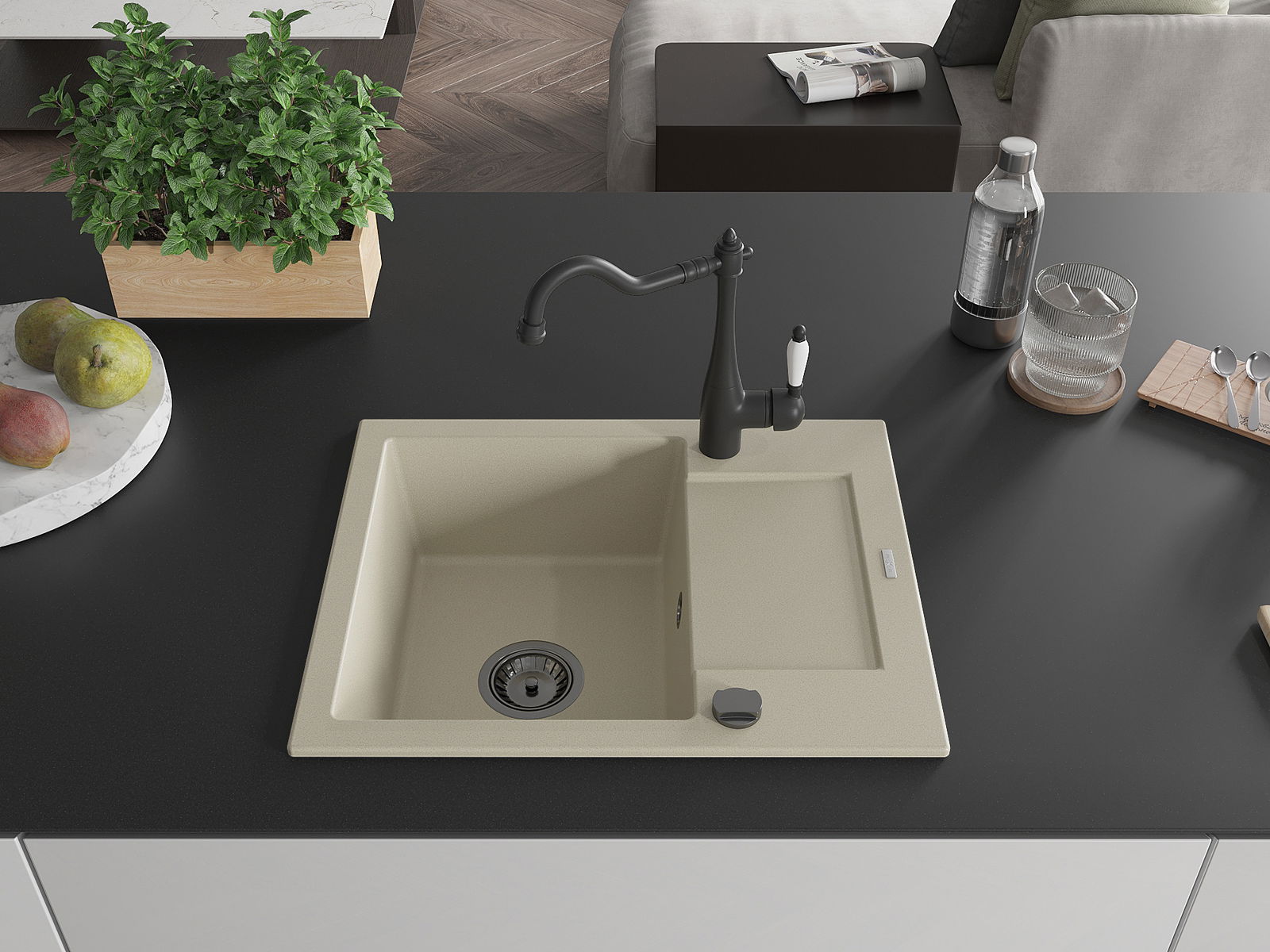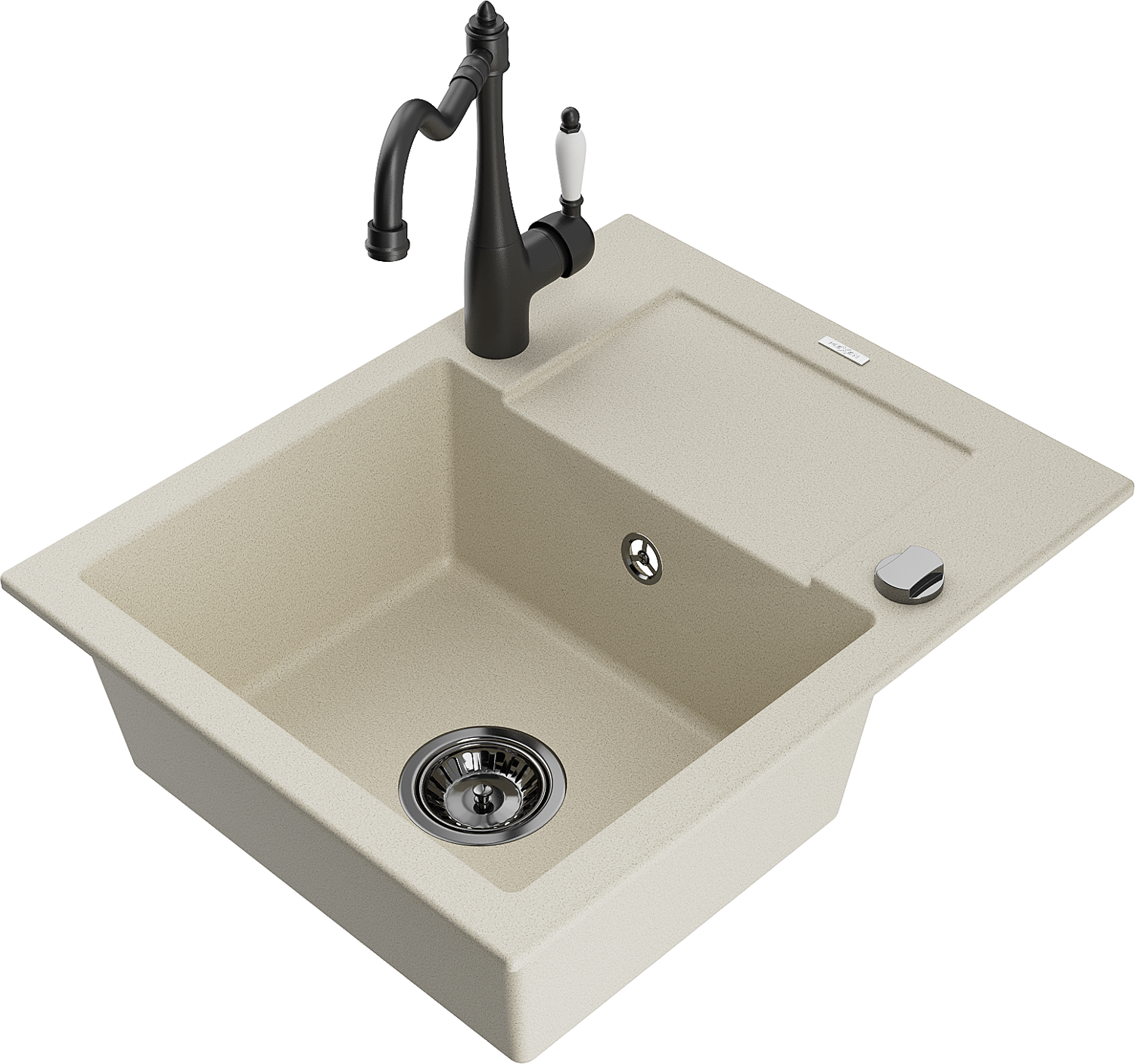 Mexen Enzo zlewozmywak granitowy 1-komorowy z ociekaczem i baterią kuchenną Carla, beżowy - 6506-69-670700-70