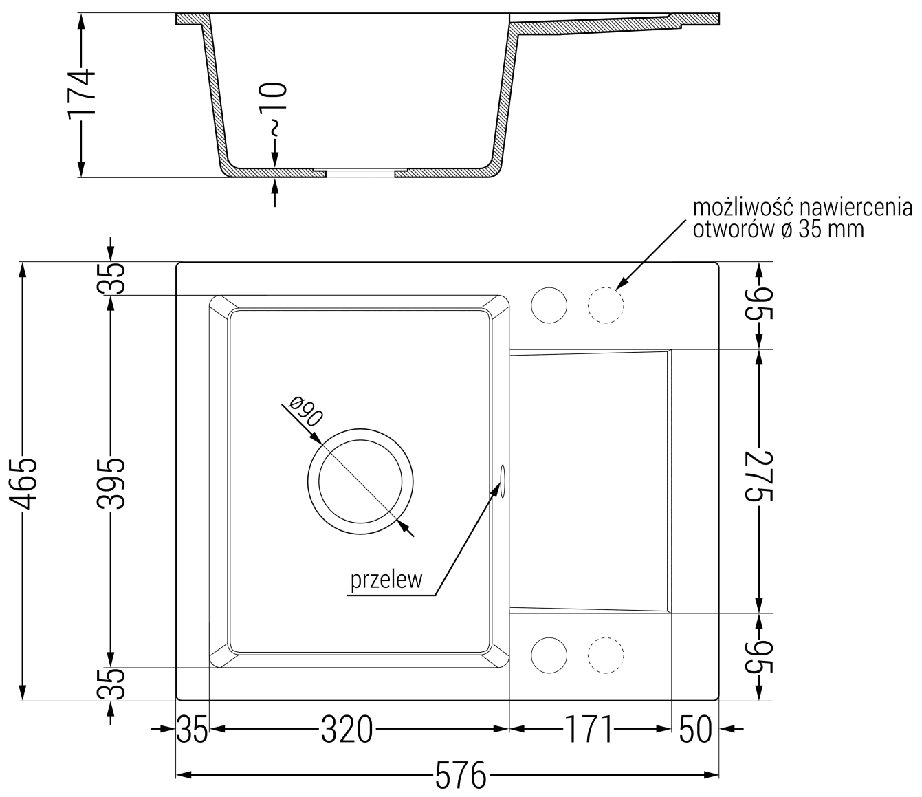 Zlew posiada 2 podfrezowane otwory o średnicy 35 mm, do samodzielnego wybicia. Można je wykorzystać m.in. do montażu dozownika na płyn, który wyeliminuje obecność plastikowych butelek w kuchni i nada jej eleganckiego wykończenia.