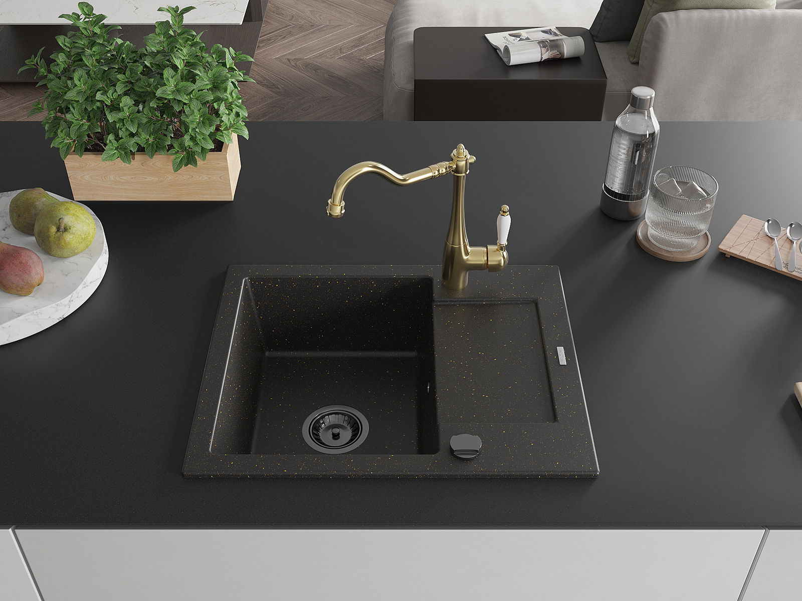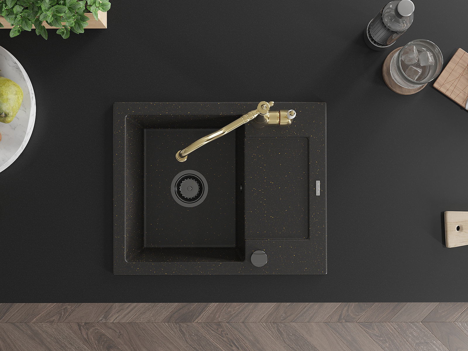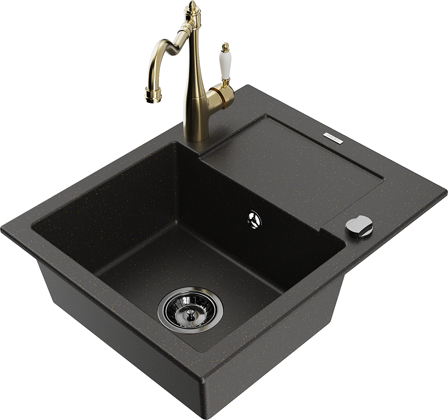 Mexen Enzo zlewozmywak granitowy 1-komorowy z ociekaczem i baterią kuchenną Carla, czarny/złoty metalik - 6506-75-670700-50-B