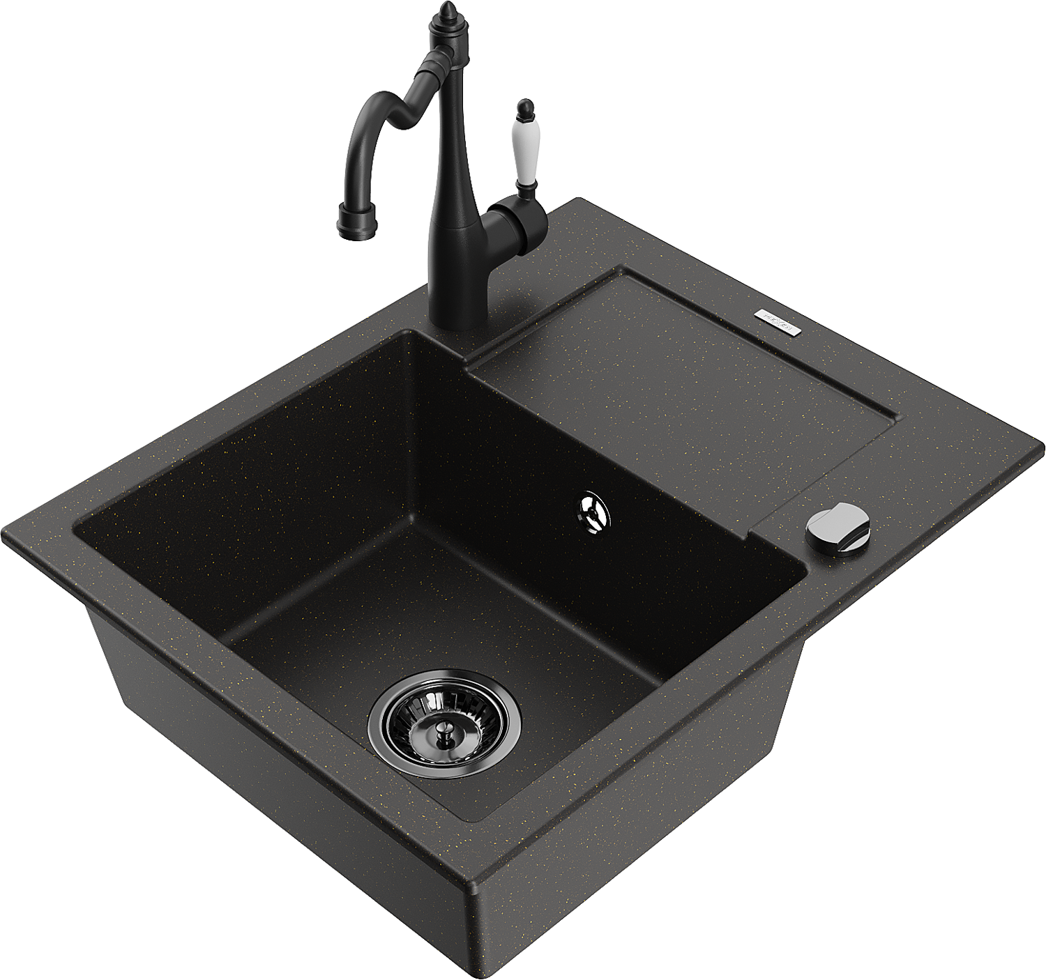 Mexen Enzo zlewozmywak granitowy 1-komorowy z ociekaczem i baterią kuchenną Carla, czarny/złoty metalik - 6506-75-670700-70-B