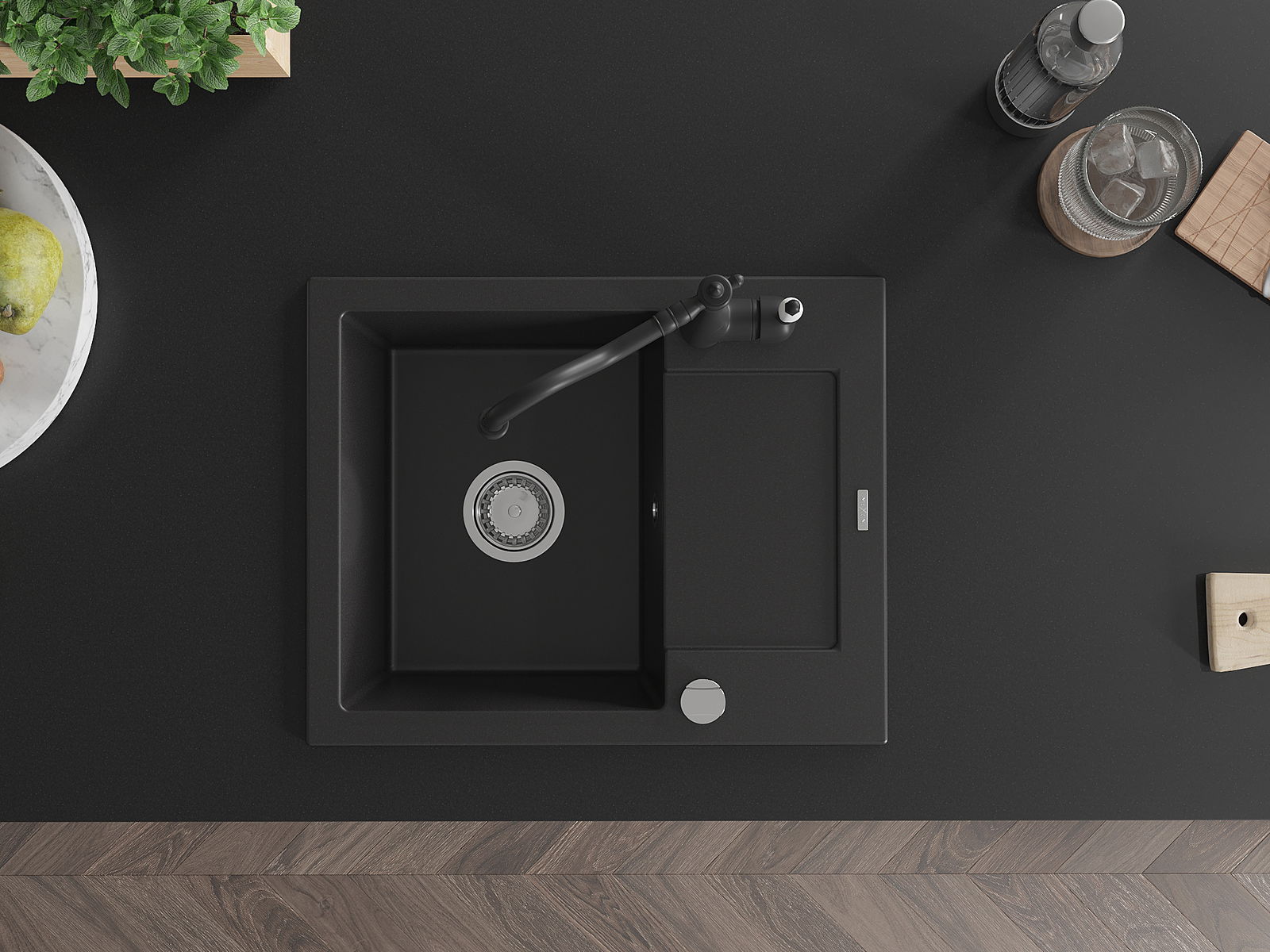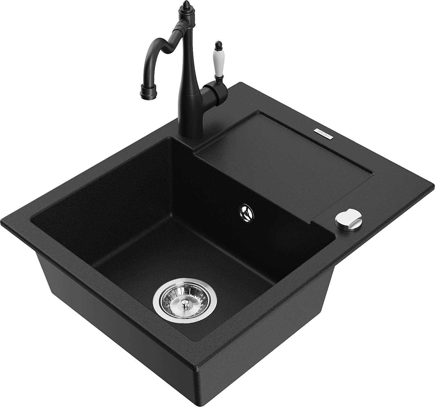 Mexen Enzo zlewozmywak granitowy 1-komorowy z ociekaczem i baterią kuchenną Carla, czarny - 6506-77-670700-70