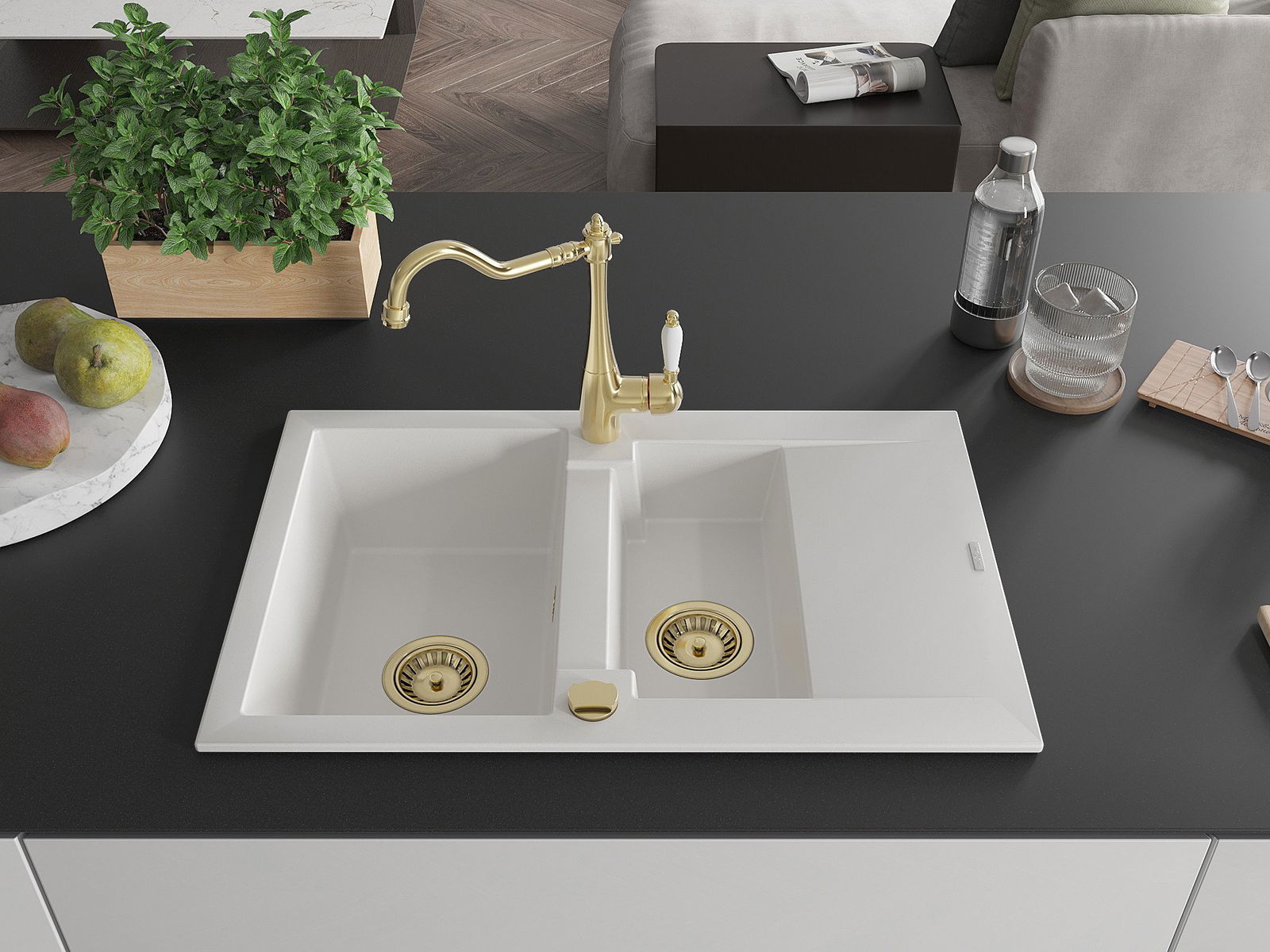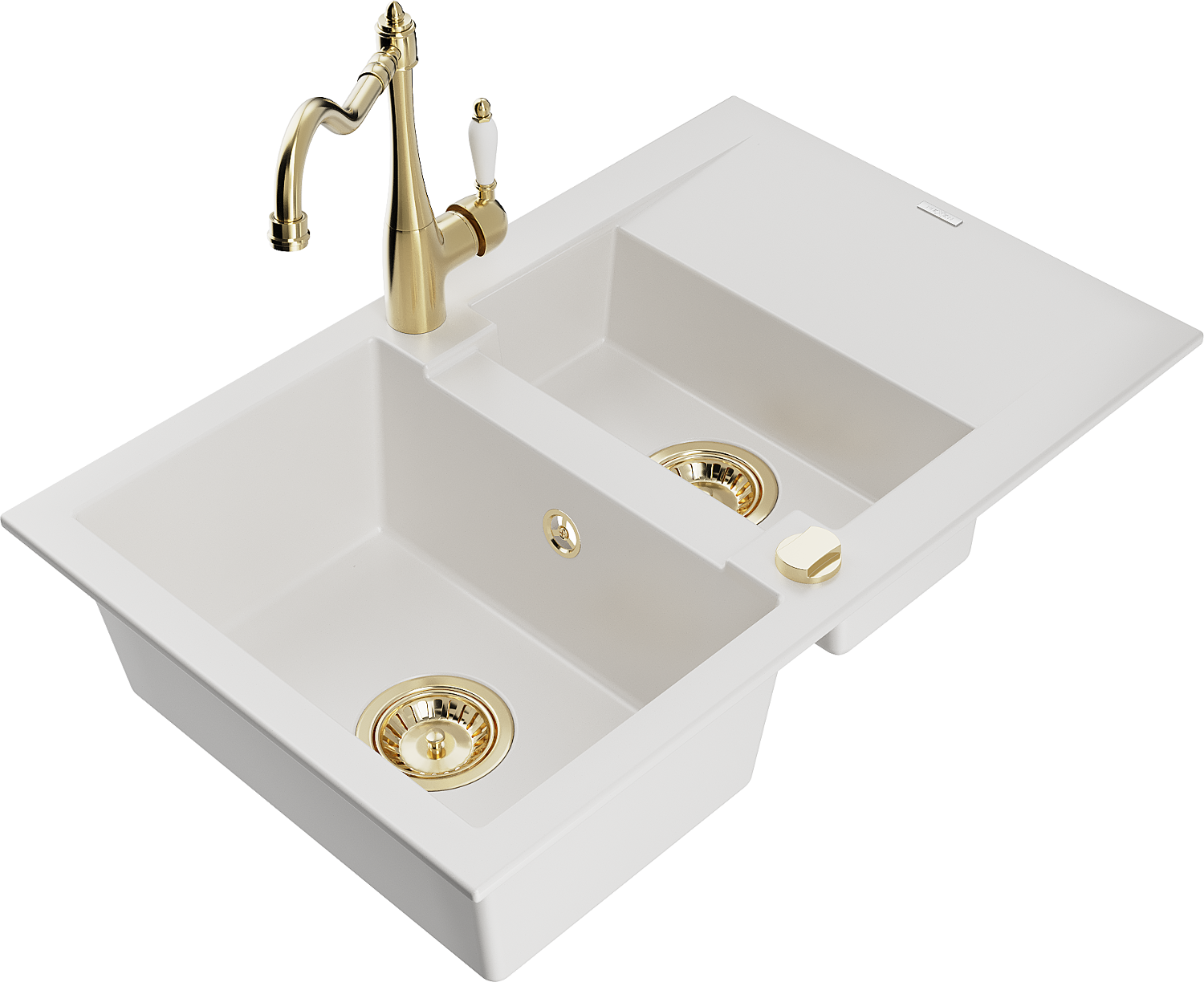 Mexen Gaspar zlewozmywak granitowy 1,5-komorowy z ociekaczem i baterią kuchenną Carla, biały - 6507-20-670700-50