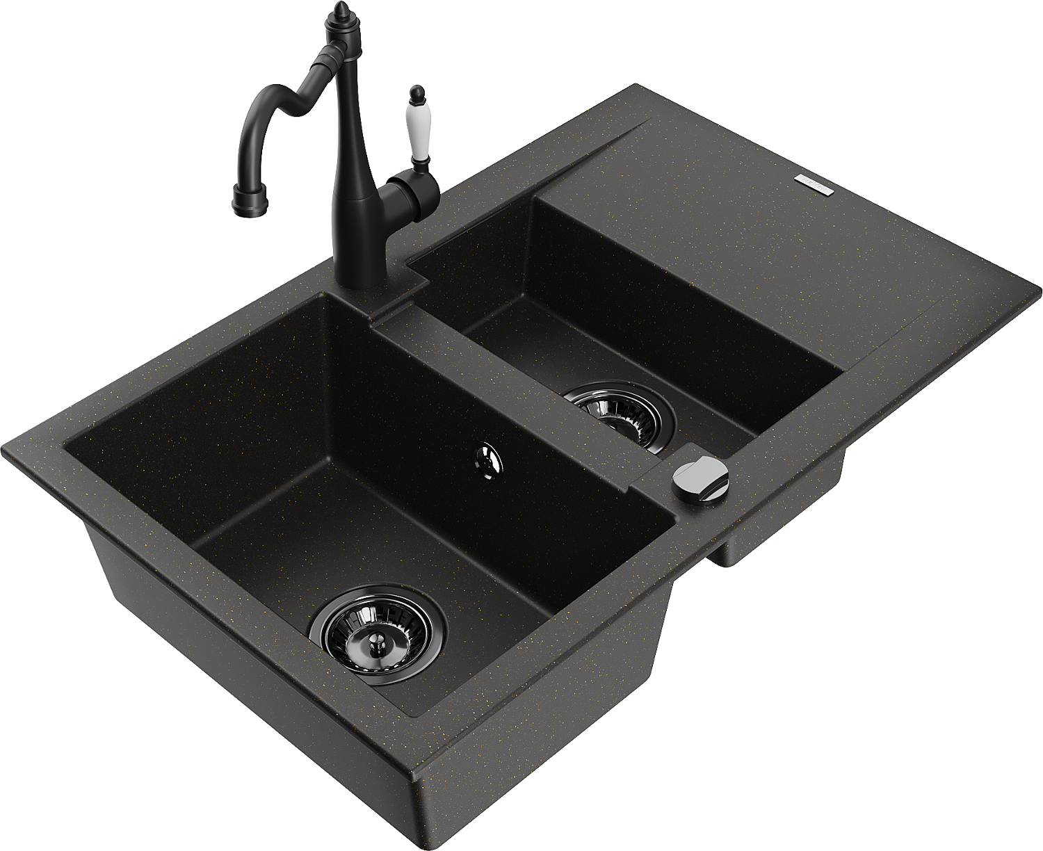 Mexen Gaspar zlewozmywak granitowy 1,5-komorowy z ociekaczem i baterią kuchenną Carla czarny/złoty metalik - 6507-75-670700-70-B