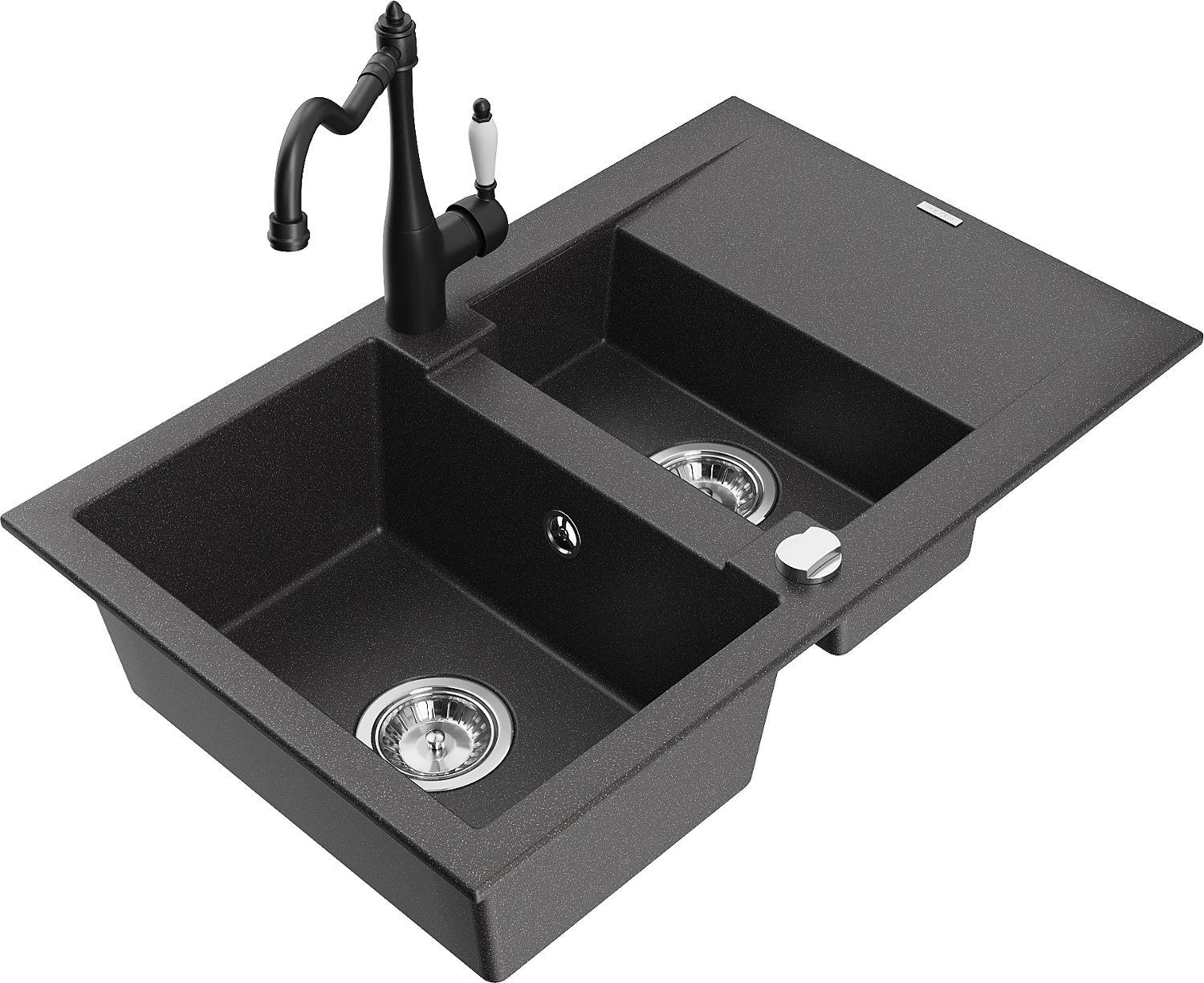 Mexen Gaspar zlewozmywak granitowy 1,5-komorowy z ociekaczem i baterią kuchenną Carla, czarny nakrapiany - 6507-76-670700-70