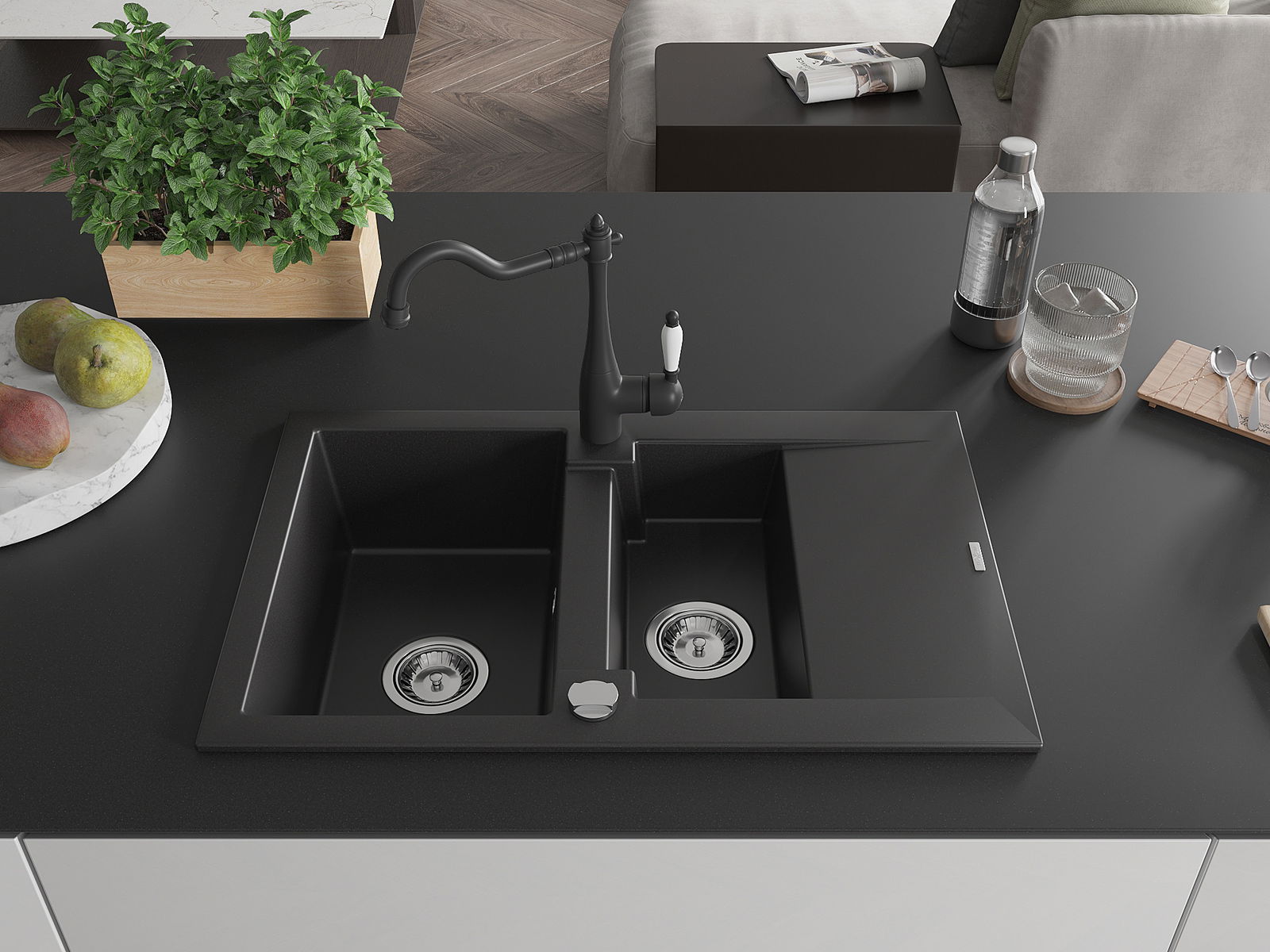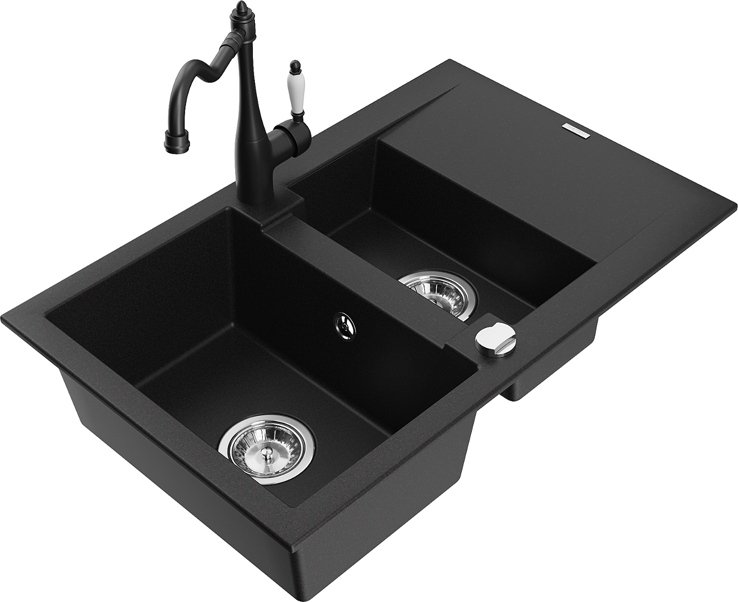 Mexen Gaspar zlewozmywak granitowy 1,5-komorowy z ociekaczem i baterią kuchenną Carla, czarny - 6507-77-670700-00